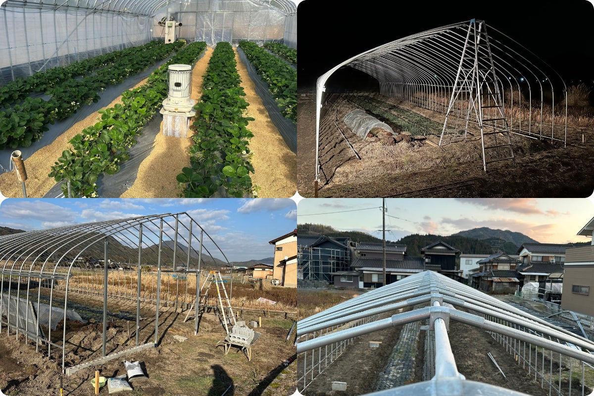 2024年には自宅横に新たに30mのパイプハウスを建設し、試験栽培を拡大。すずみのりいちご農園での直売も試験的に実施しました。町内で遊休施設となっていたパイプハウスを購入し移設。みんなに手伝ってもらいなんとか完成しました。