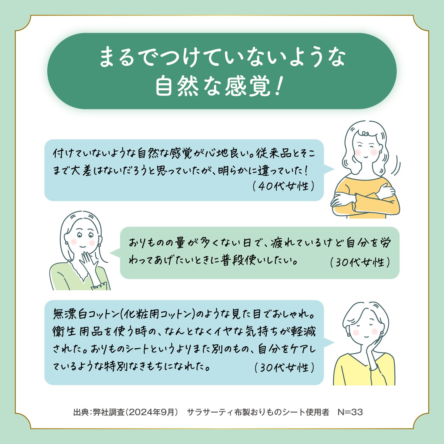 「サラサーティコットン100 布製おりものシート」は発売前にモニタリングを重ねて作り上げてまいりました。モニタリングの中では「おりものの量が多くない日で疲れているけど自分を労ってあげたいときに使用したい」「自分をケアしているような特別な気持ちになれた」「従来品と大差ないと思ってたけど明らかに違っていた」といった嬉しいお声を頂きました。