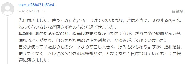 私たちが製品に込めた「つけてないような」という理想の感覚を、実際に「本当で」と感じていただけたこと、そして、交換するのを忘れるくらい快適に過ごしていただけたこと。開発者として、これ以上の喜びはありません。