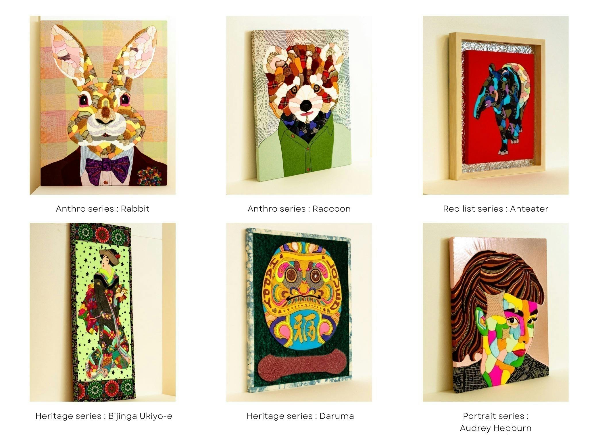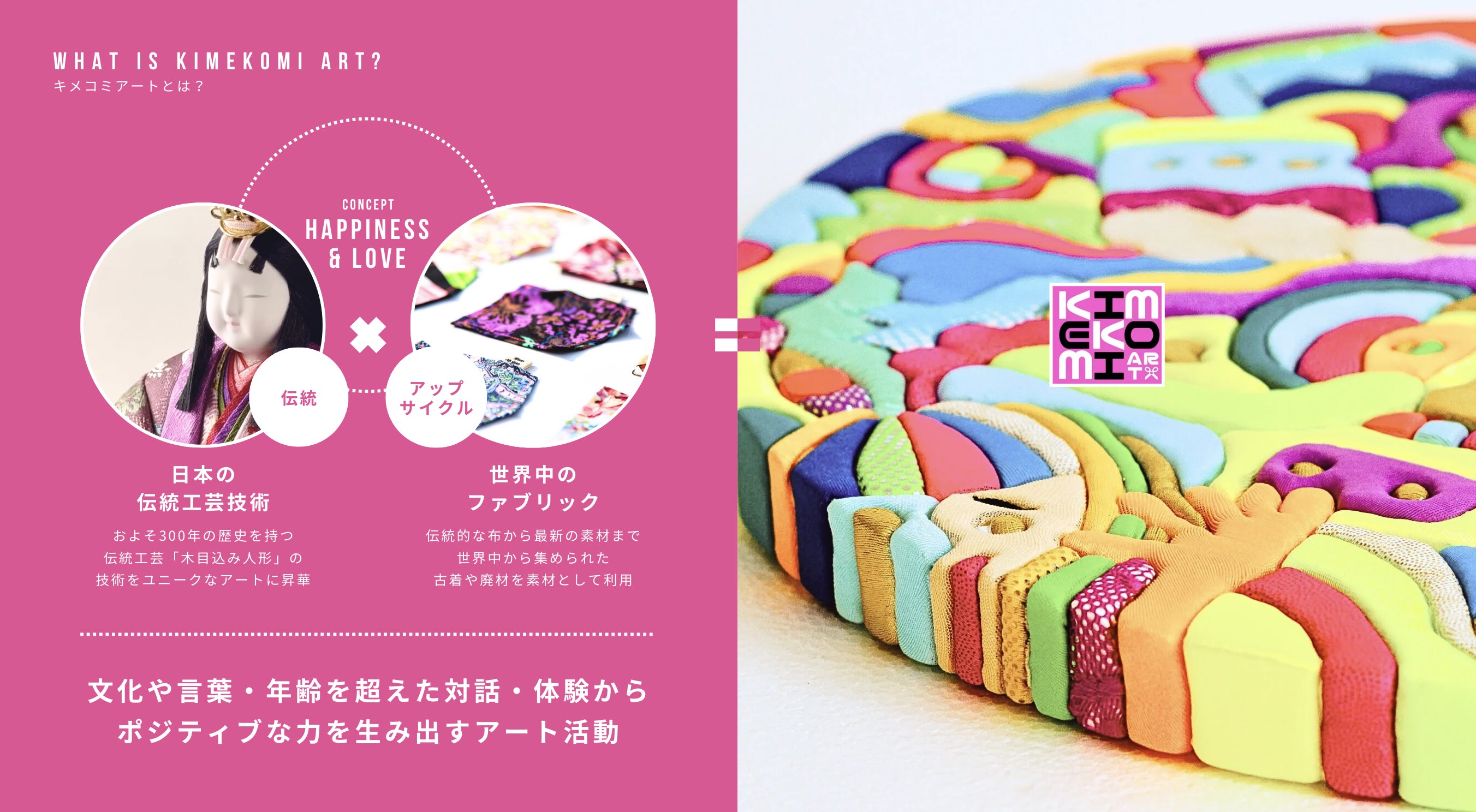 代表的なシリーズ「キメコミアート」は伝統・最先端ファブリックの廃材などを利用し言語や文化を超えポップに地球環境など様々な問題への意識を高めるシリーズとして多くの人へHappy&Loveを届けて参りました。