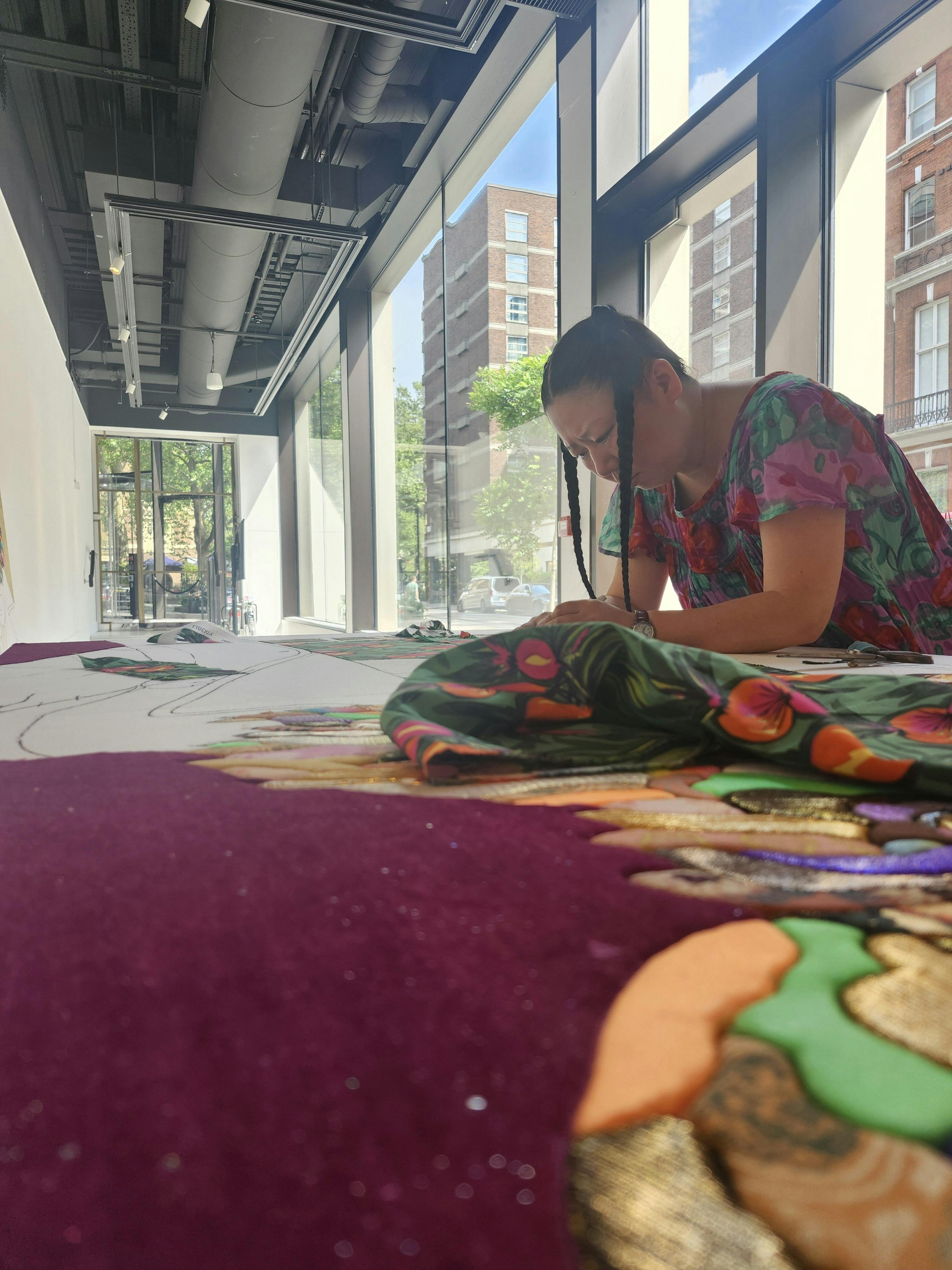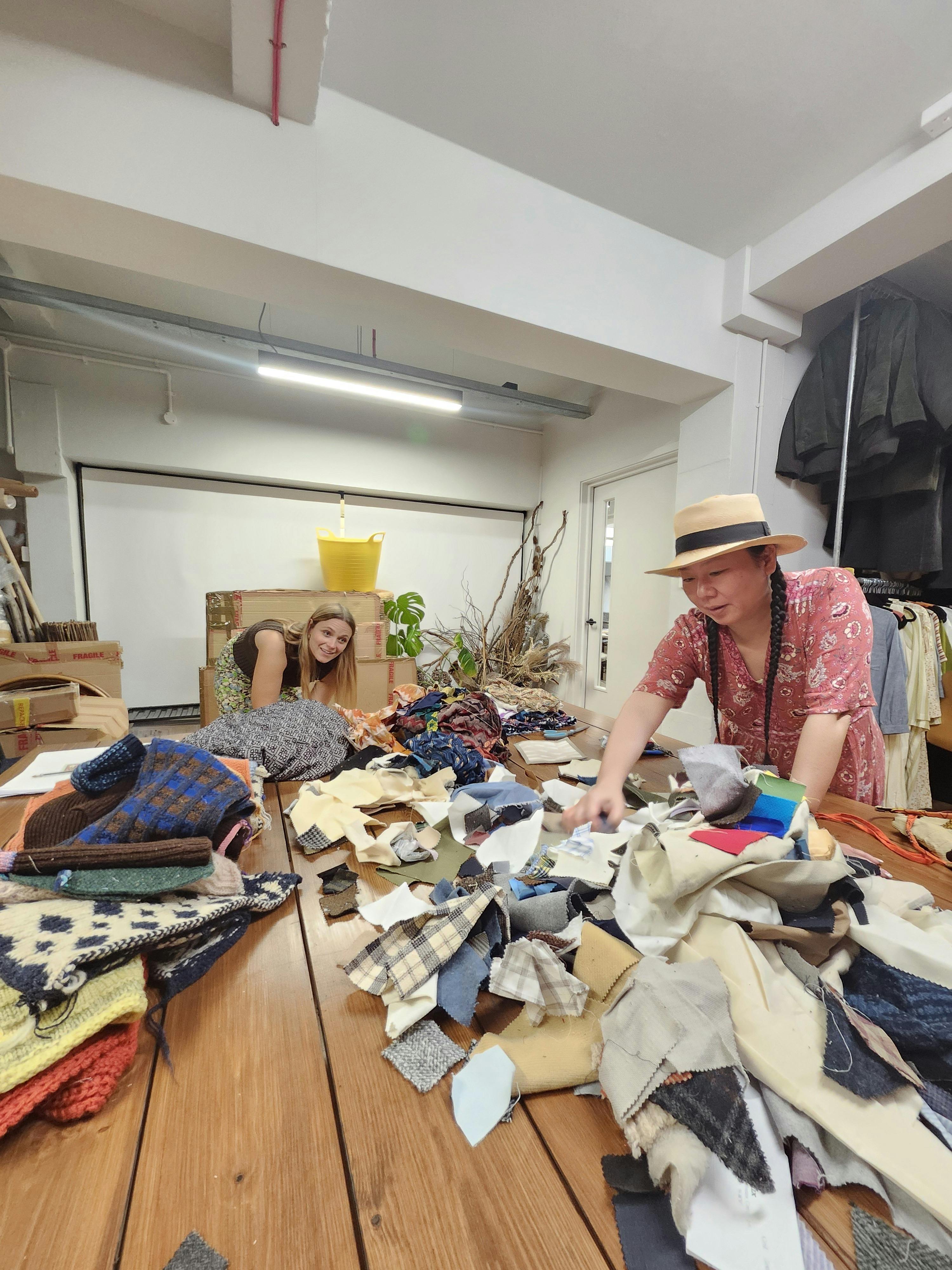 3日目からオープンスタジオで日本の生地とイギリスの生地をミックスさせて、作品を仕上げています。
