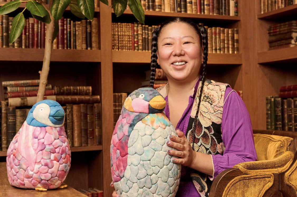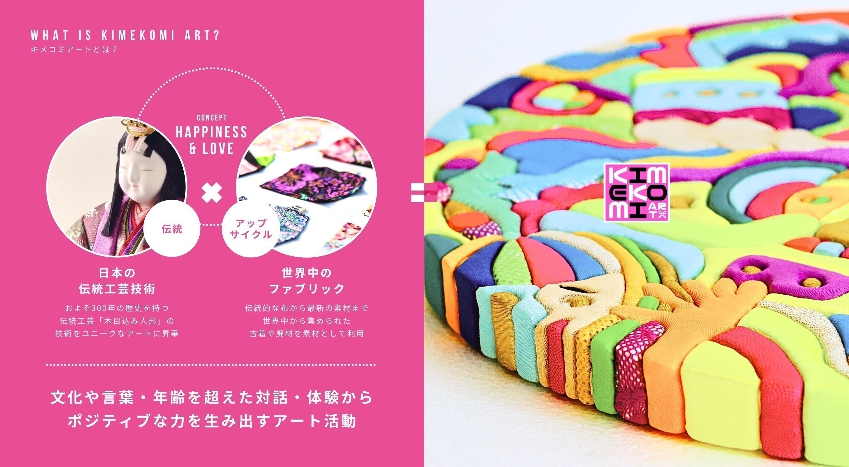 キメコミアートとは、300年の歴史を持つ日本伝統技法「木目込み人形」にインスパイアされ、新たなポップアートの世界を築き上げました。ファッション、伝統工芸、先端技術、そして廃材を幅広く使用し、新旧の素材を融合させて一つの作品に仕上げています。テキスタイルは古代から世界共通で私たちにとって身近で重要な要素です。その魅力と重要性を再認識させる作品を通じて、地球環境を顧みない大量消費や過剰包装、短縮された製品ライフサイクルなどの社会問題について啓発しています。カラフルでポップな作品は人を自然と笑顔にさせる不思議な魅力にあふれ、国内外のギャラリーから高く評価されています。