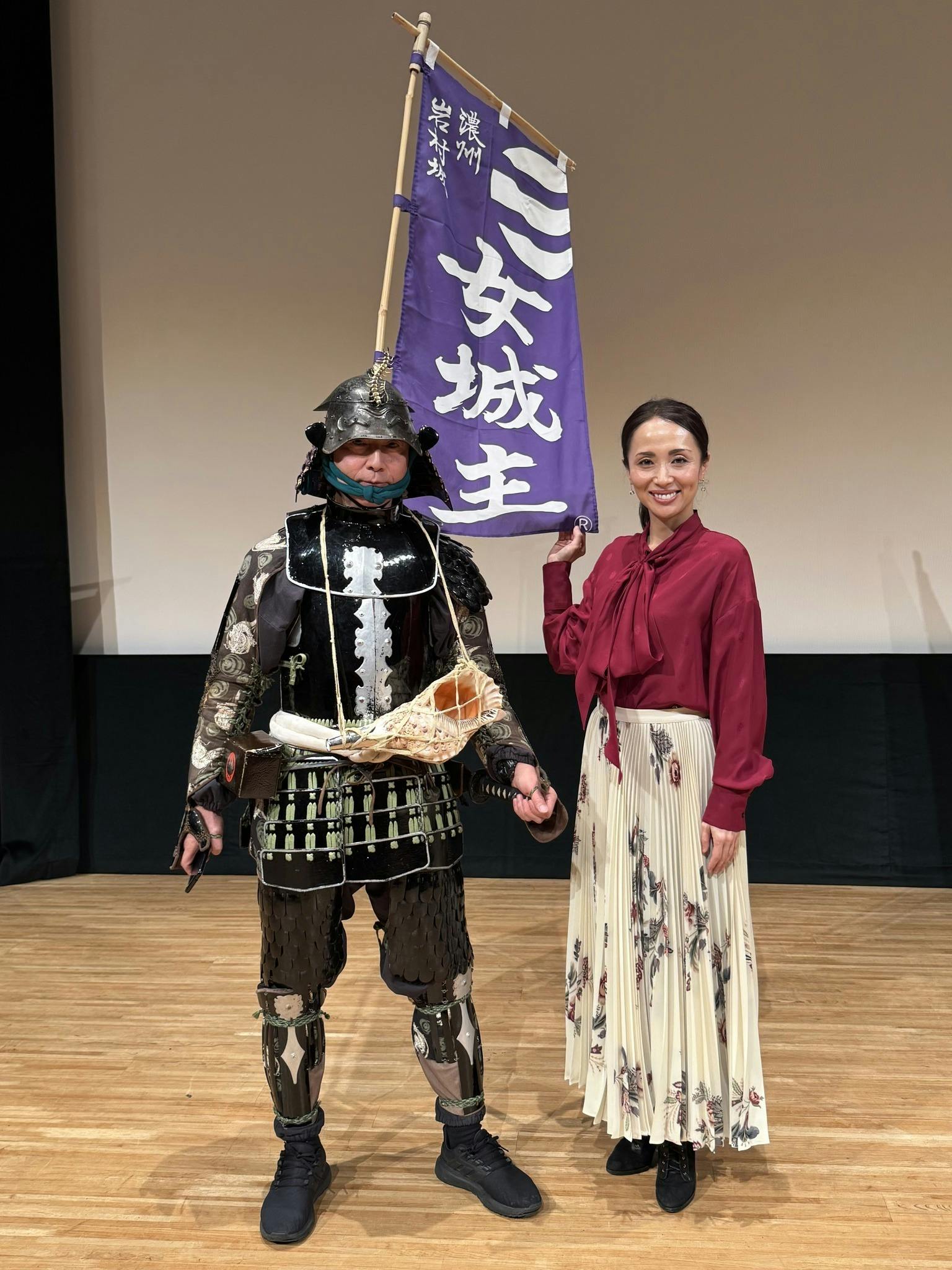 2025年12月21日(土)、岐阜県恵那市(後援)の文化センターにて、岩村町観光協会との共催による先行上映会を開催しました。当日はあいにくの雨模様でしたが、350名もの方にご来場いただき、心より感謝申し上げます。上映後には、「女城主」お艶(つや)の方役の楊原京子さんと私が登壇し、赤松プロデューサーの司会のもと、舞台挨拶を行いました。この日、楊原さんは岩村城への登城も叶いました。この日はお城EXPOの開催日でもあり、観光協会事務局長として大変ご尽力されている羽柴さんは残念ながらご不在でしたが、他の観光協会の皆さま、そして岩村甲冑工房武将隊が甲冑姿で登壇してくださり、会場は賑やかな雰囲気となりました。改めて御礼申し上げます。また以前、京都・光雲寺で行われたマルタ甲冑完成披露式にご出席いただいた三宅様、泉様が、偶然にもご来場くださっており、お声がけいただいたことには大変驚くと同時に、嬉しい再会となりました。
