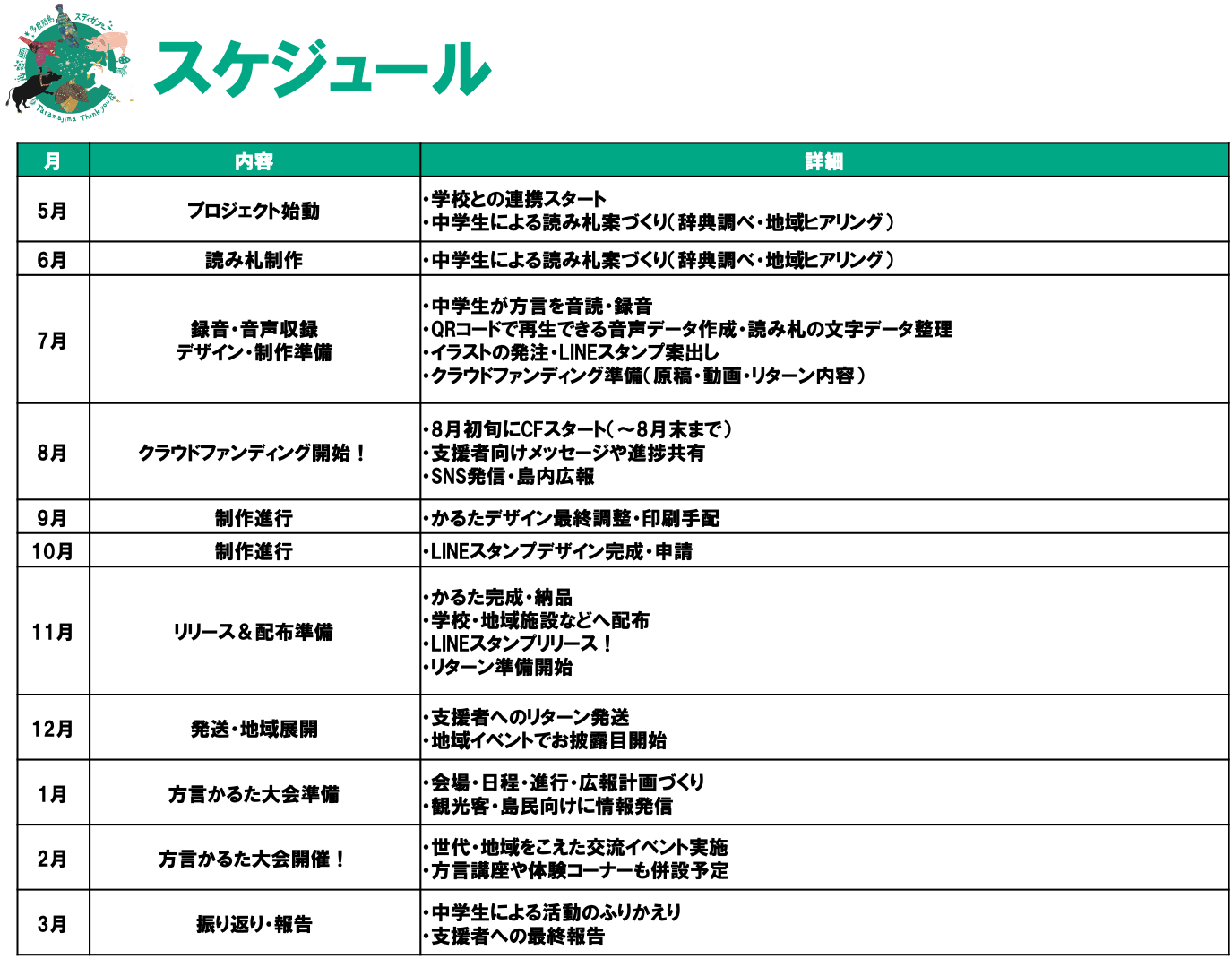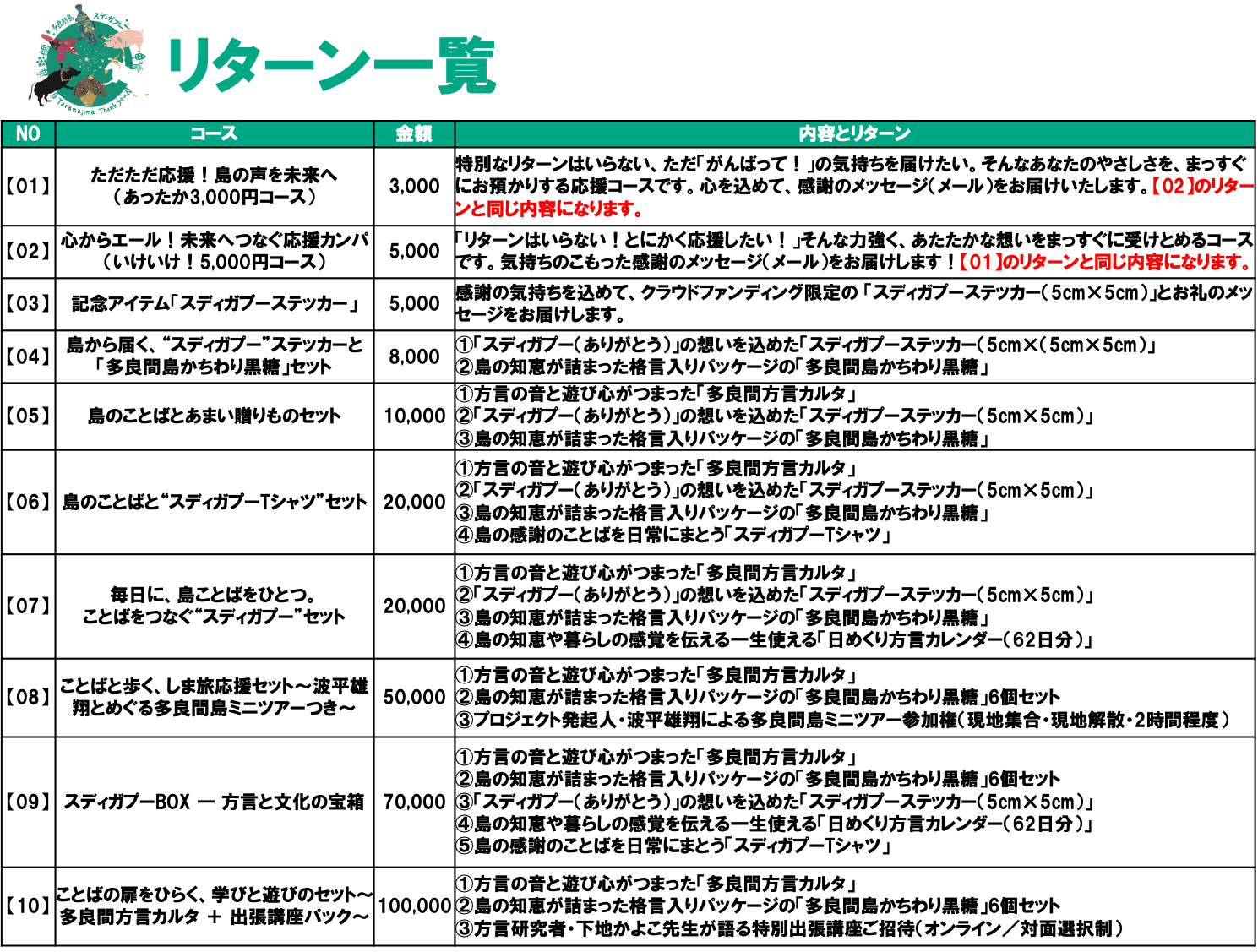 今回のクラウドファンディングでは、その一部をご支援いただくために、制作応援カンパのほか、限定ステッカーや「スディガプー」Tシャツ、方言カレンダー、カルタ本体、そして講座参加チケットなど、多彩なリターンをご用意しました。