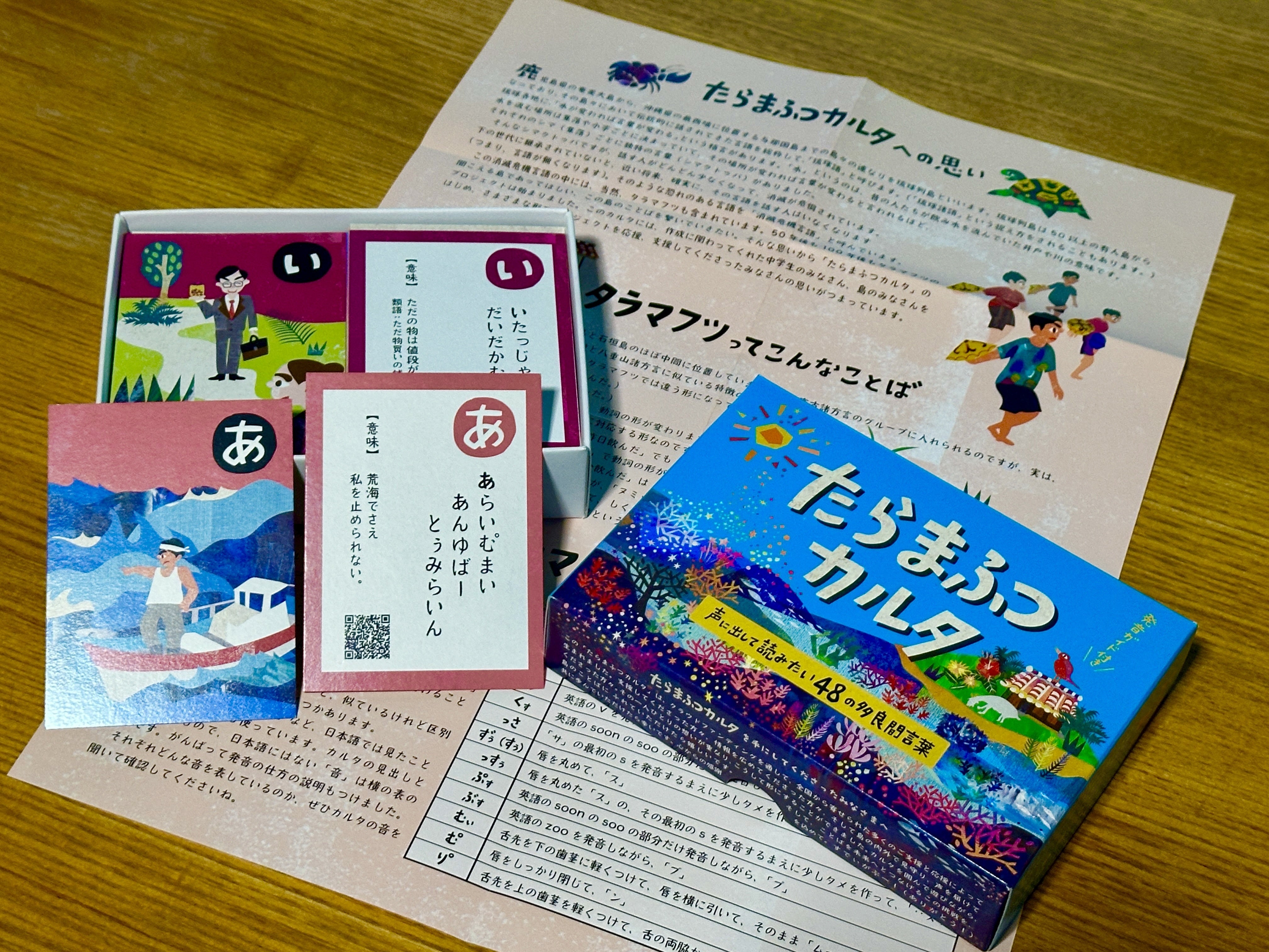 たくさんのご支援と応援をいただきながら進めてきた 「たらまふつカルタ(多良間方言カルタ)」が、ついに完成しました!本日、完成したカルタが手元に届き、胸がいっぱいになりました。手に取った瞬間、これまで子どもたちが一生懸命に取り組んできた日々、地域の方々の協力、そして全国から寄せられた皆さまの温かい想いが重なり合い、一つの形になったことを感じました。支援してくださったすべての方々に、心から感謝申し上げます。中学生たちは、地域の方々に話を聞きながら、方言の意味を調べ、一つひとつ丁寧に読み札を考えました。絵札には、多良間島の自然や文化、そして島の人々の暮らしが生き生きと描かれています。遊びながら学べるこのカルタは、世代を超えて島のことばに親しみ、未来へつなぐ大切な宝物となりました。その中の一枚には、こんな言葉があります。「べーたが たらまずまー かぎずま」(私たちの多良間島は美しい島だ)この一文は、子どもたちが心から誇りに思うふるさと・多良間島の美しさを表しています。皆さまの応援があったからこそ、この言葉が今、子どもたち自身の声として未来に響こうとしています。これから、子どもたちの手元にこのカルタを届ける準備を進めています。生徒たちが笑顔でカルタを囲み、声を出して「たらまふつ」を読み合うその瞬間を思うと、胸が高鳴ります。地域の方々と一緒に開く「たらまふつカルタ大会」も、今からとても楽しみです!そして!ぜひ皆さんにも、このカルタを一緒に楽しんでいただきたいです。ぜひ、僕と一緒にカルタをしに多良間へ遊びに来てください!海の風を感じながら、島のことばで笑い合う時間を、皆さんと共有できたら最高に幸せです。さらに、日常でも“たらまふつ”にふれていただけるよう、LINEスタンプも販売中です!▶ ご購入はこちら https://line.me/S/sticker/31764931「ありがとう(すでぃがぷー)」「さようなら(あとぅからなー)」など、島の日常のことばをかわいいイラストと共にスタンプにしています。ぜひ日々のやりとりで使っていただければ幸いです。これまで支えてくださった皆さまに、改めて心からの感謝を申し上げます。すでぃがぷー!(ありがとう!)