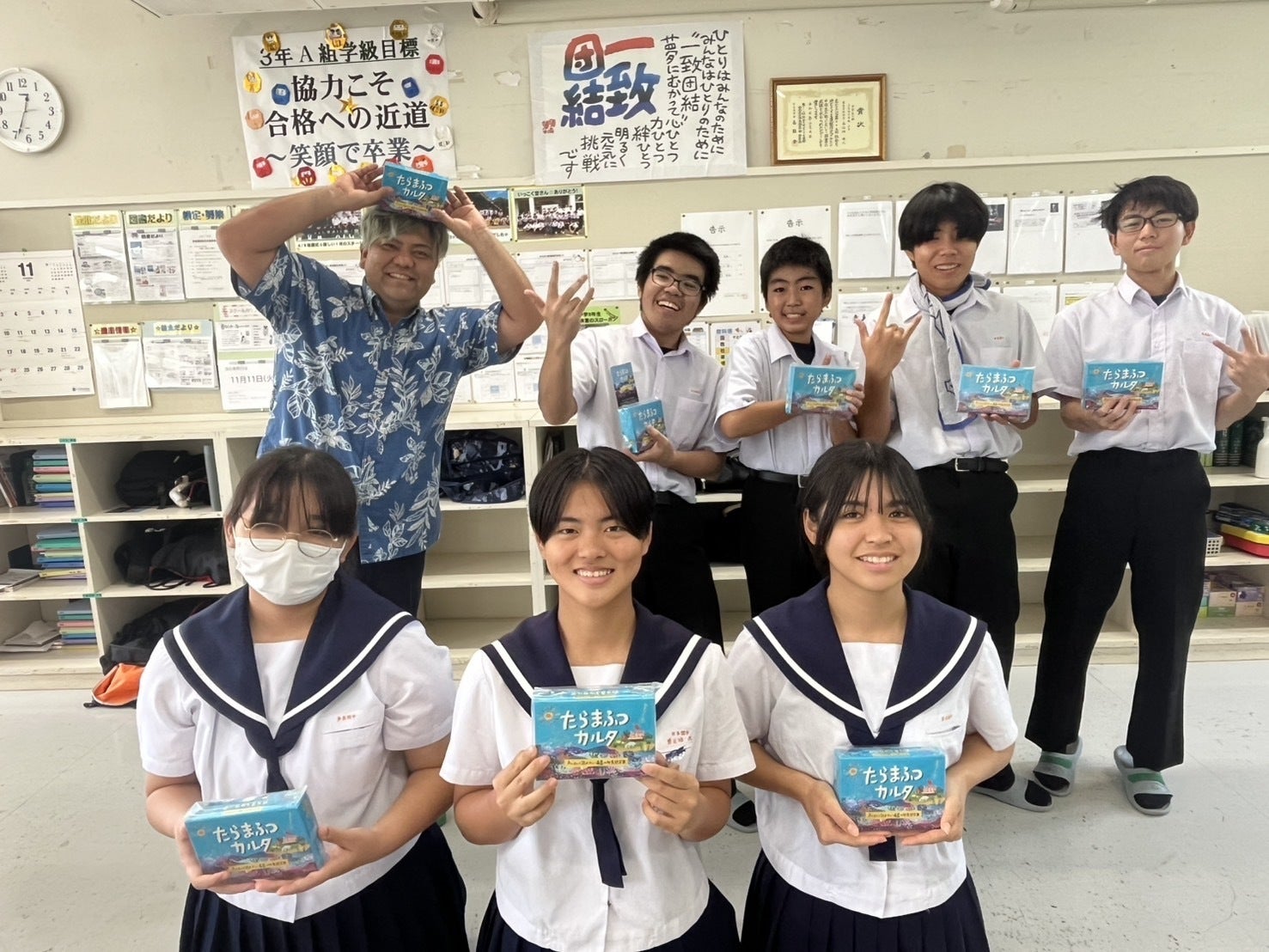 このたび、多良間中学校3年生の皆さんへ「多良間方言カルタ」を贈呈いたしました。あわせて、方言カルタ大会も実施しました。カルタ大会では、読み札が読まれるたびに笑い声が起きたり、「この言葉、おばぁが使ってた!」「意味が分かると面白い!」といった声があがり、教室はとてもあたたかい空気に包まれました。方言カルタを通して、自分たちが育った島の言葉や文化を“知識”ではなく“体験”として感じる時間になったと感じています。参加した生徒たちからは自分たちの声にハニカミながら「楽しかった!」「家でもやりたい」「多良間の方言っておもしろいなぁ」といった声も聞かれ、とても喜んでくれていました。このカルタが、これからそれぞれの道へ進む3年生にとって、ふと島を思い出すきっかけや、自分のルーツを誇りに思える存在になれば嬉しく思います。今後は、保育園・幼稚園・小学校をはじめとした教育施設へも順次贈呈し、島のことばや文化に触れる機会を広げていく予定です。遊びながら自然と方言に親しみ、世代をこえて島の記憶が受け継がれていく、そんな循環を目指して取り組みを続けていきます。改めて、制作に関わってくれた皆さん、応援してくださった皆さんに心より感謝申し上げます。これからも、島のことばと文化を未来へつなぐ活動を続けていきます。