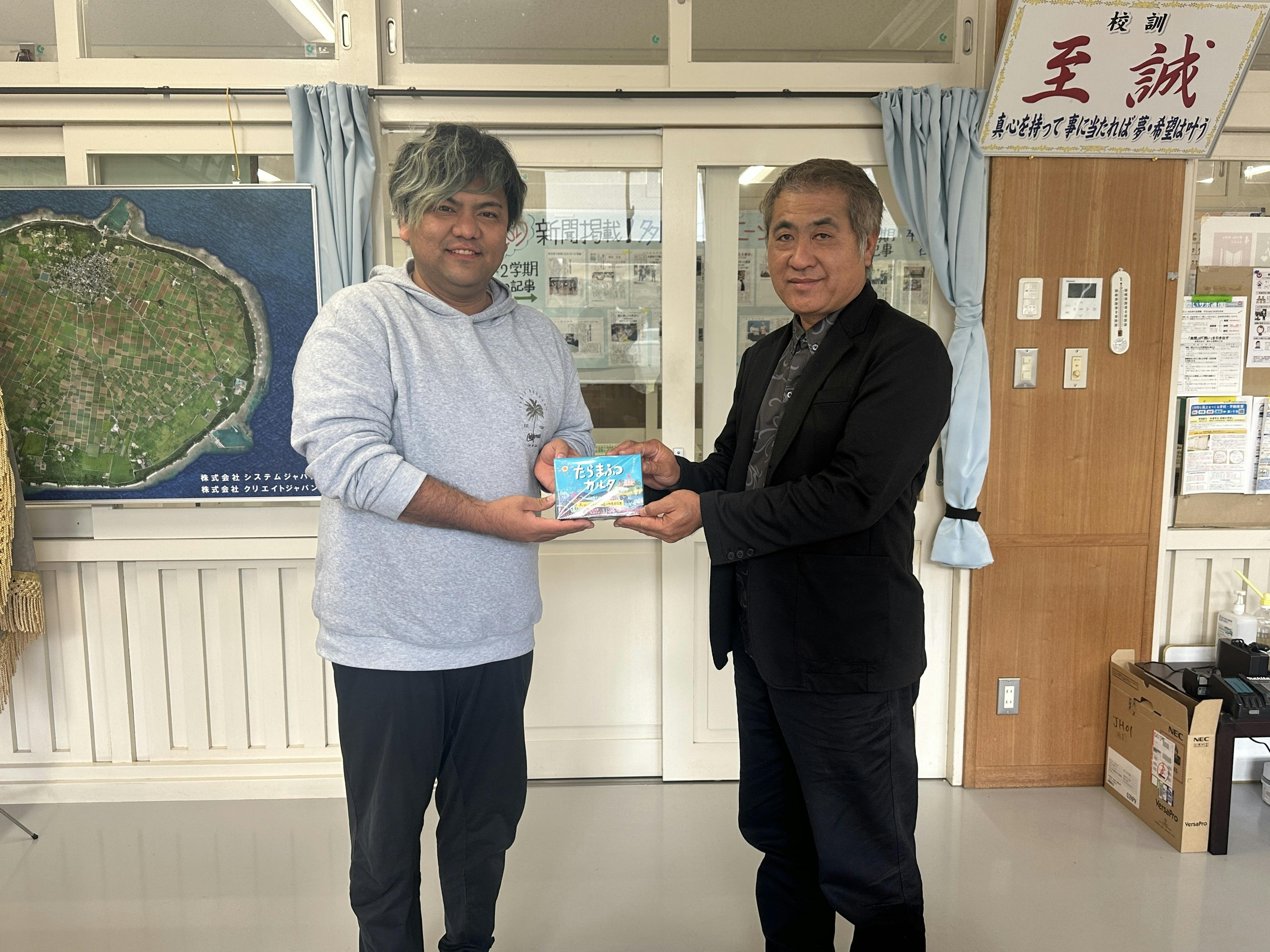 皆さまのおかげで、完成した方言カルタを、島内の保育園・幼稚園・小学校・中学校へ無事に贈呈することができました。