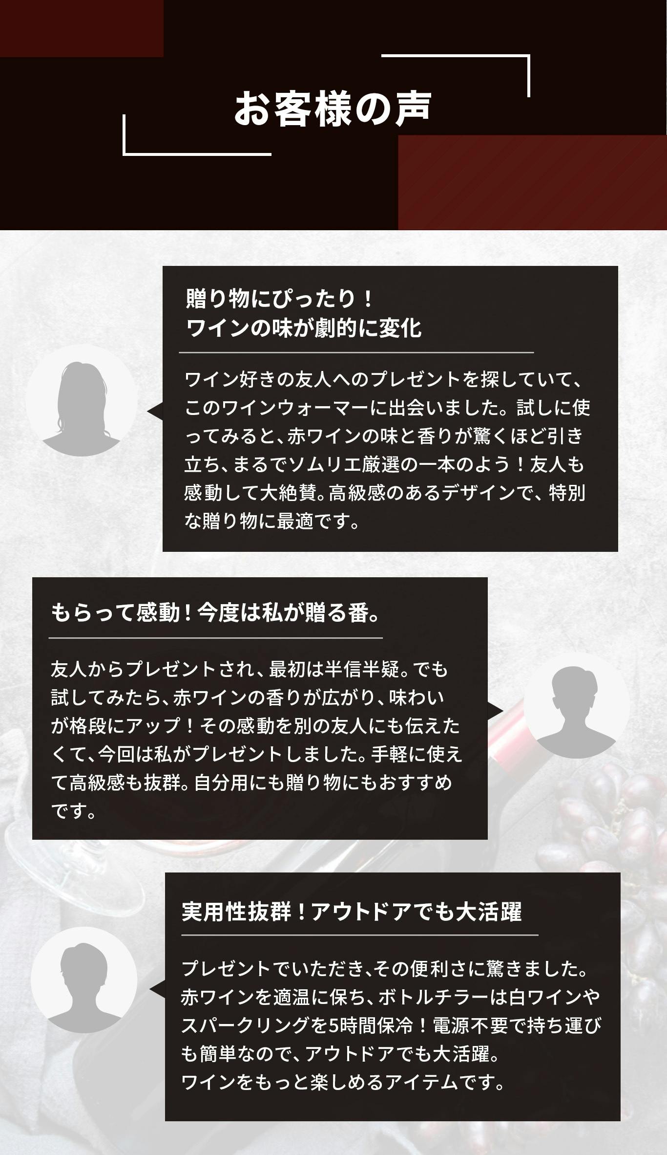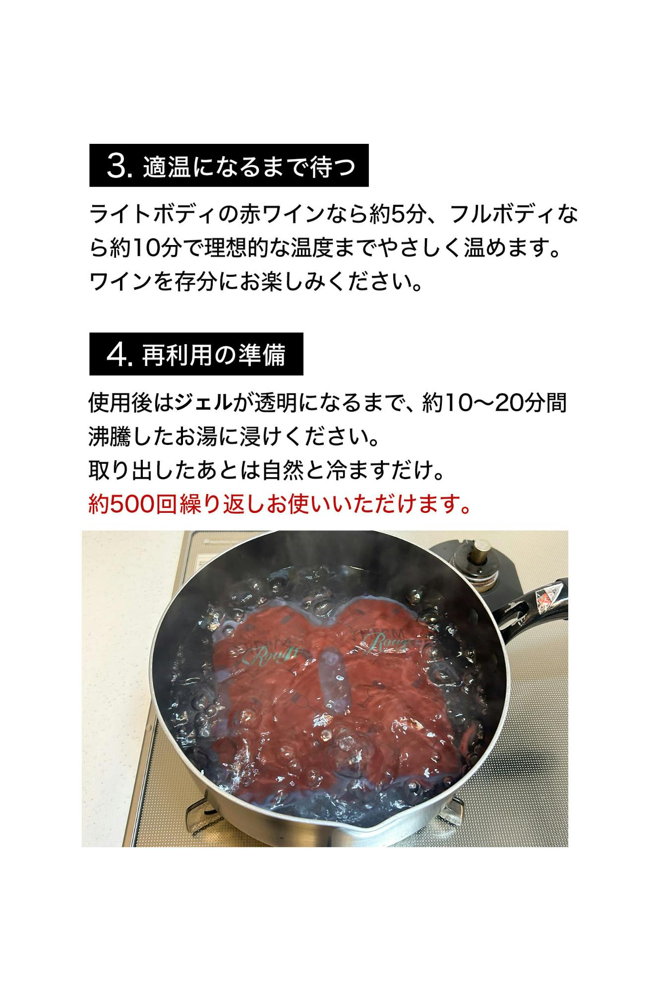 独自の温感ジェルが、赤ワインをわずか10分ほどでやさしく温め、香りや味わいをしっかりと引き出してくれます。