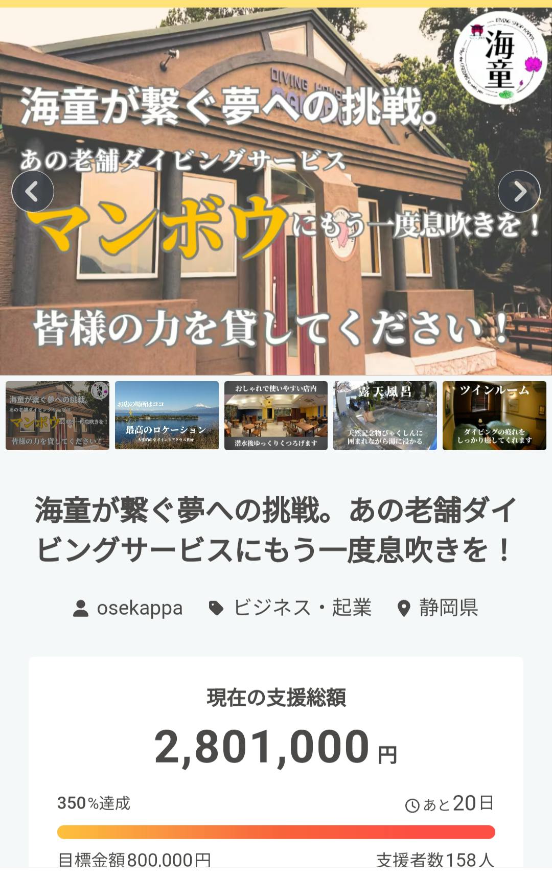 今回のマンボウ再建プロジェクトが4月7日(月)18時にスタートしてから2時間39分後に目標金額を達成いたしました!!!