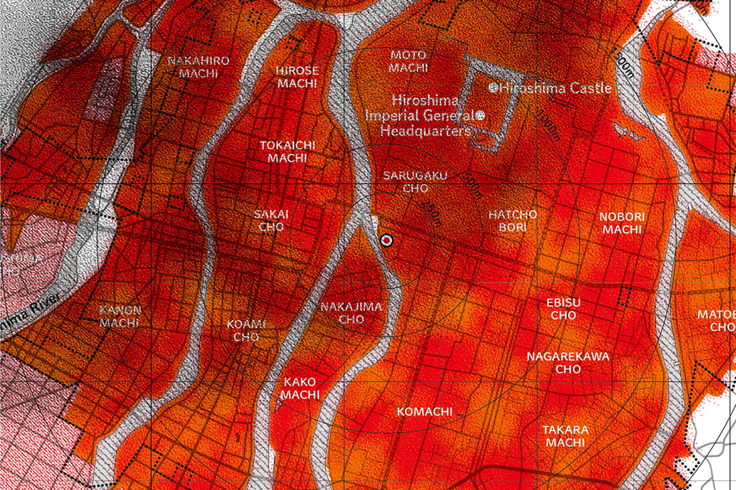 現在からは想像することが難しい1945年の被爆状況を地図に表し、現在の広島と表裏の地図にすることで、過去から現在までが地続きで繋がっていることを感じていただけるよう制作しました。