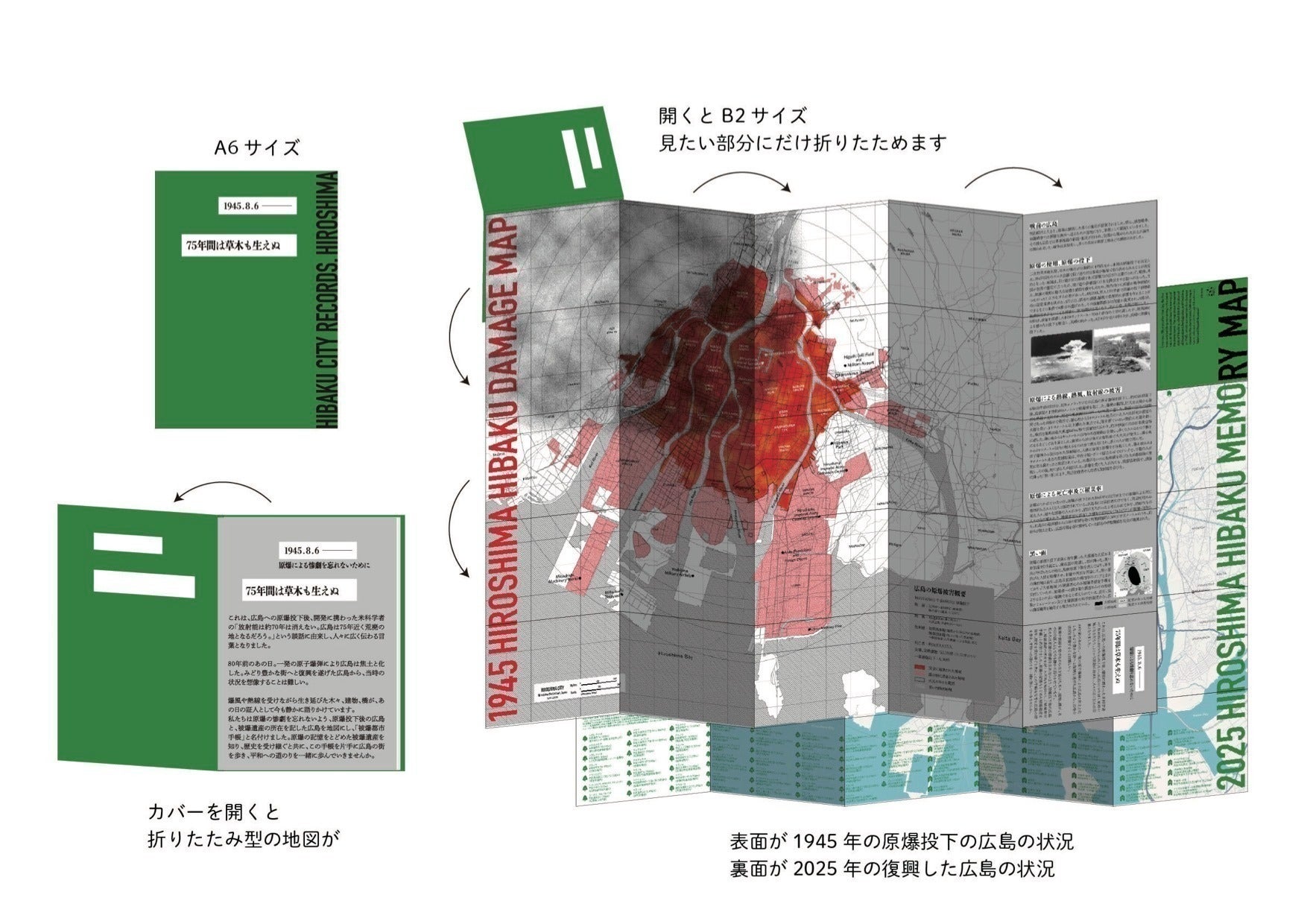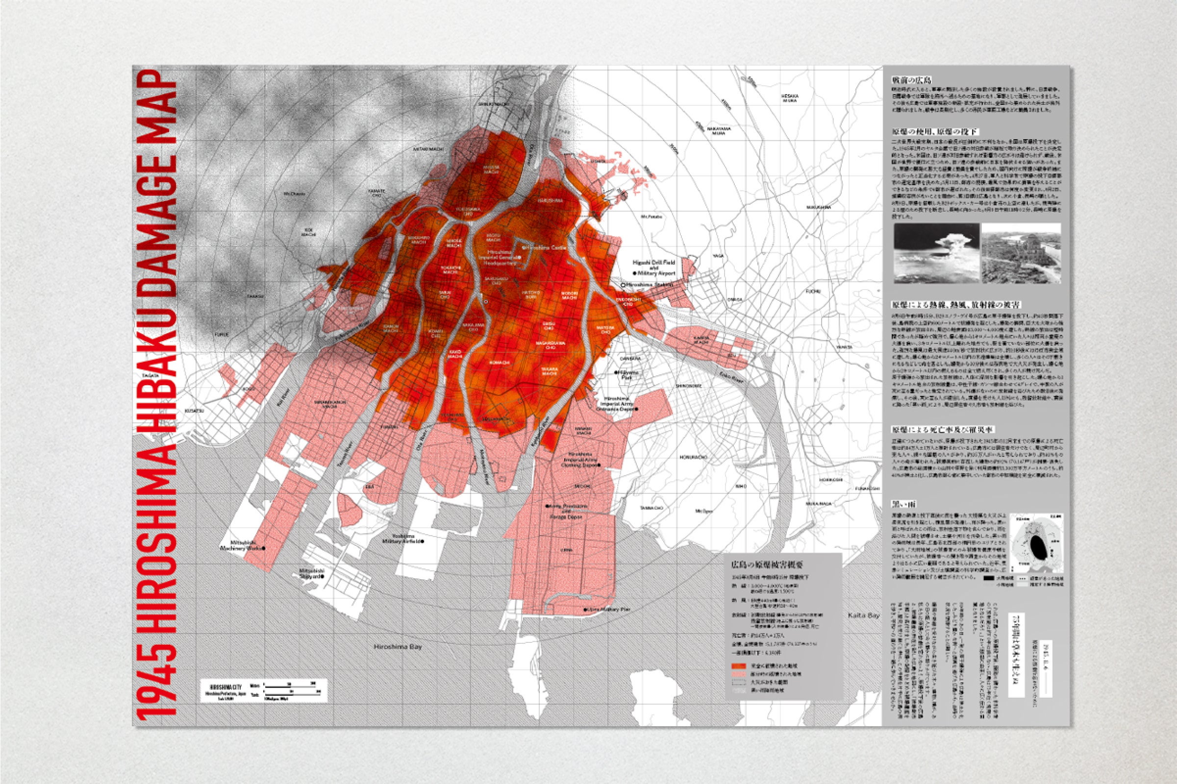 現在からは想像することが難しい1945年の被爆状況を地図に表し、現在の広島と表裏の地図にすることで、過去から現在までが地続きで繋がっていることを感じていただけるよう制作しました。