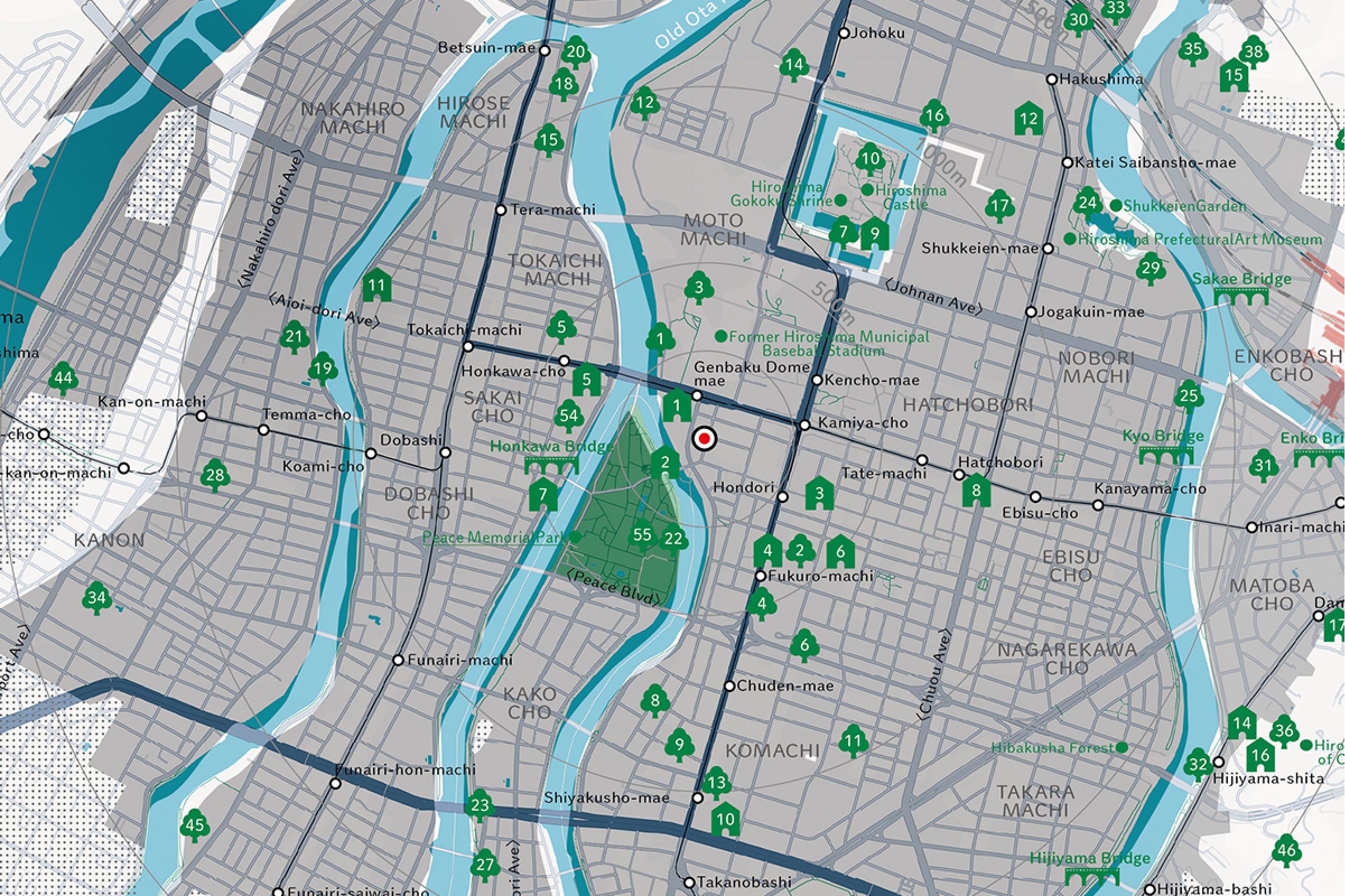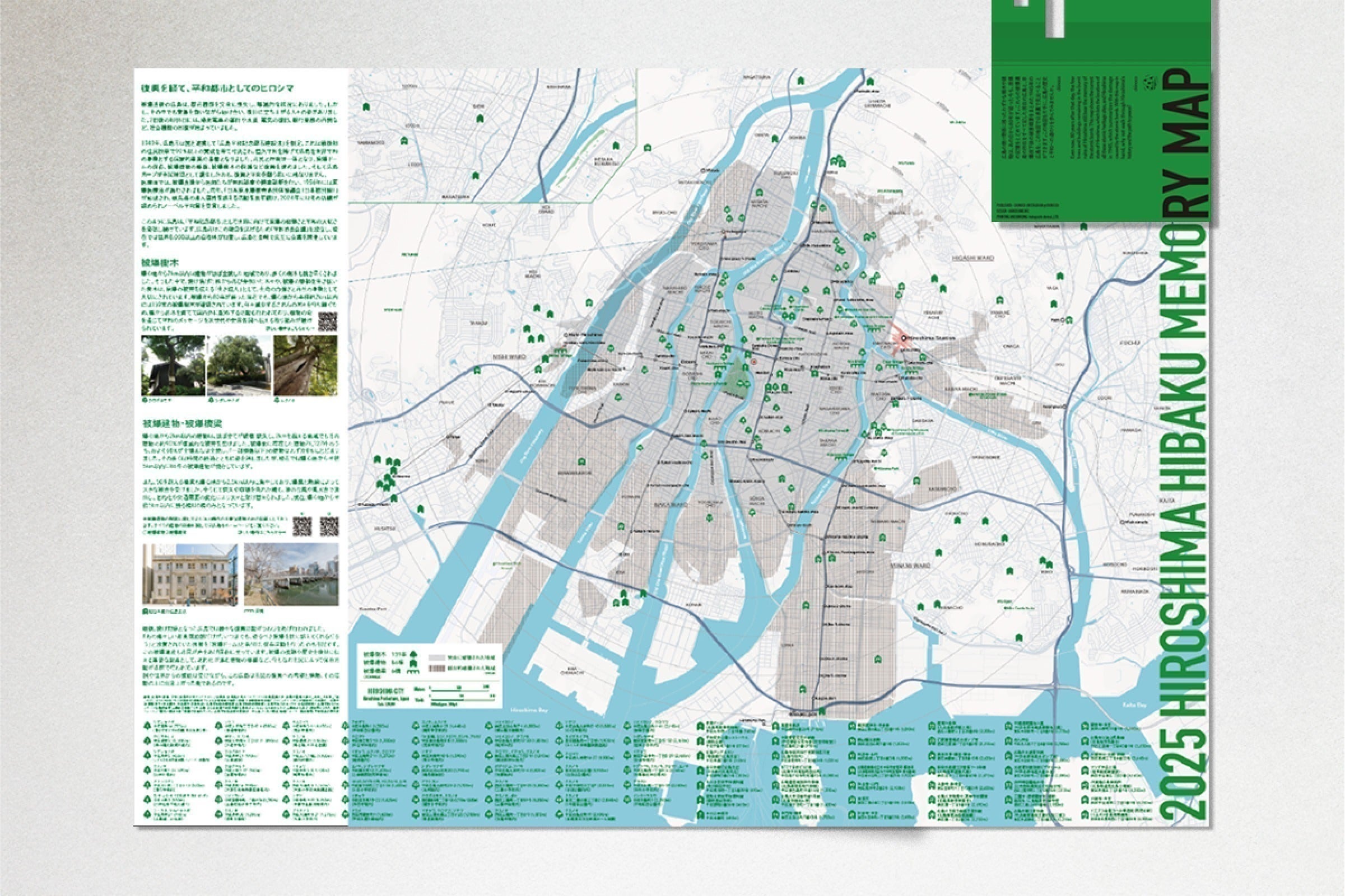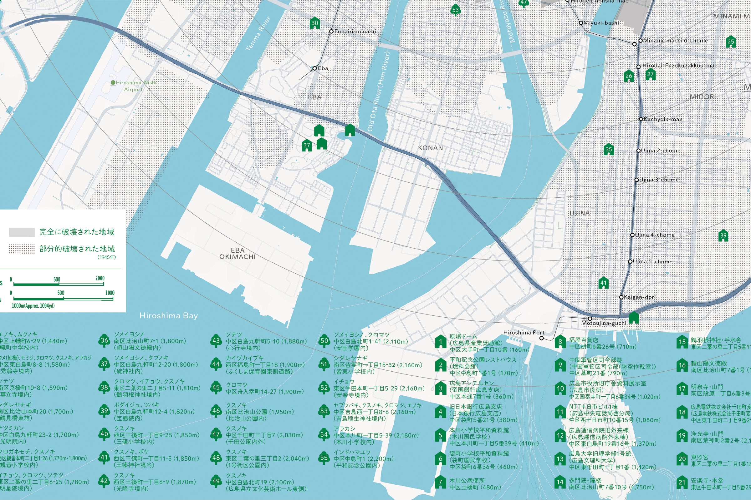 この地図には、現存する被爆遺産(被爆樹木、被爆建物、被爆橋梁)をすべて記しています。また、街が復興していった過程と、平和都市として世界に発信する活動の一部を記載しています。