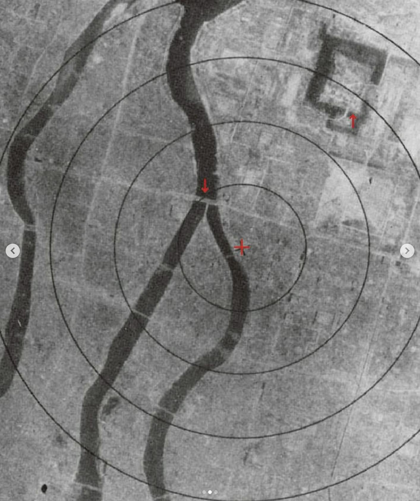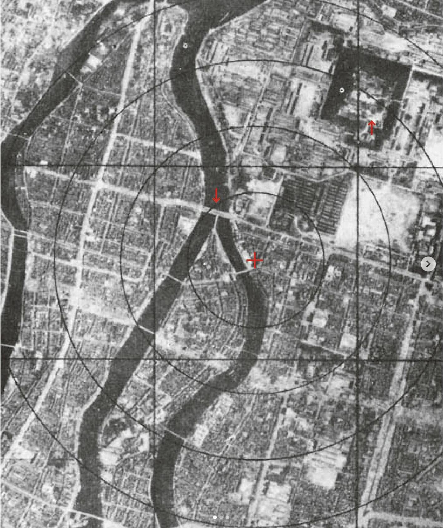同心円の中心が爆心地。すぐ左上に目標の相生橋。画面右上の矩形は広島城。すごい範囲で本当に何もなくなってしまったのがよく分かる写真。