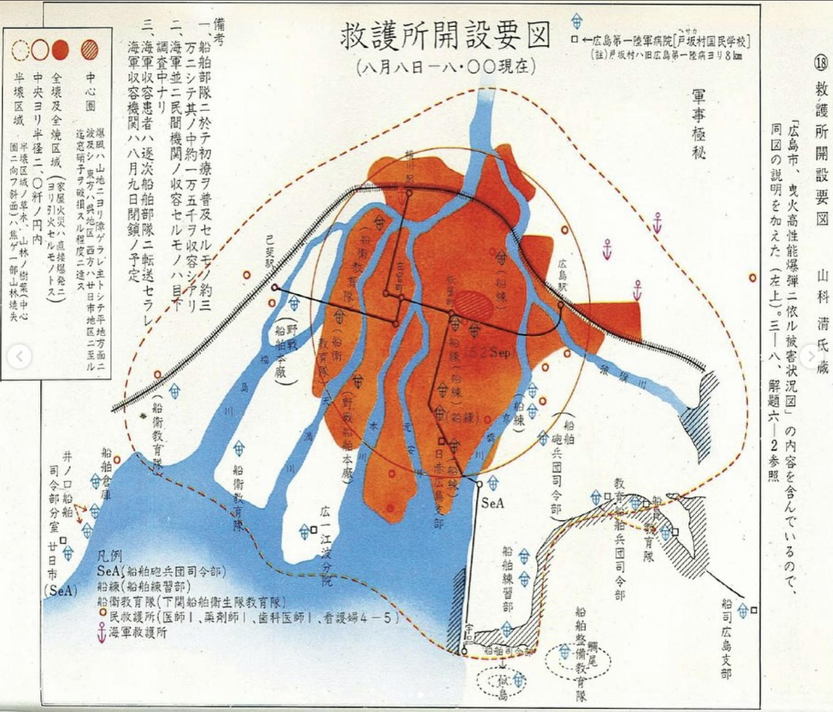 (地図はwikipedia広島市への原子爆弾投下、Earth No War NGO (ENWN) 広島原爆の爆心と被爆地図 、