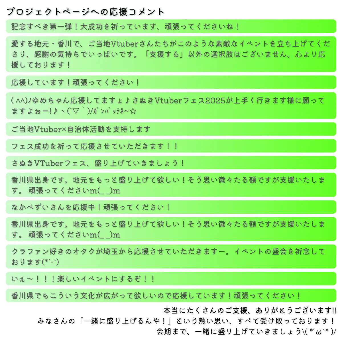 2025/06/18 19:00-目次-1)香川県内の全自治体へのご協力依頼が完了しました!2)いただいた応援メッセージ・コメントを追加しました!3)6/20のクラファン告知配信枠を作成しました!4)各アンバサダーの活動報告---------------------------------------------1)香川県内の全自治体へのご協力依頼が完了しました!本日、香川県内の全自治体へのご協力依頼が完了しました。6月中にご回答をいただき、7月頭にはご参加いただける自治体紹介をいたします!2)いただいた応援メッセージ・コメントを追加しました!プロジェクトページに、いただいた応援メッセージ・コメントを掲載しました。実行委員・アンバサダー共に、とても励まされております(TДT)随時、いただいたものを追加してまいります!3)6/20のクラファン告知配信枠を作成しました!もともとプロジェクトスタートを予定しておりました6月20日に、このプロジェクトのご説明をする配信を予定しております。コメント欄で疑問点や質問なども受け付けてますので、お気軽にコメントしていただけると嬉しいです!(ご挨拶のみや応援のみのコメントも大歓迎です!)新情報も、ある…かも!?!?【さぬきVTuberフェス】告知配信Vol.3「クラファンスタートっ!」 日時:2025年6月20日(金) 22:00~23:00 場所:YouTube(瀬戸兎ゆめのチャンネル)4)各アンバサダーの活動報告<饂飩之ミコ> X・YouTube・瀬戸内リゾート ベッセルおおちさまに、フライヤーを設置! 行かれるご予定のある方は、ぜひ貰ってください⁽⁽٩(◍˃ᗜ˂◍)۶⁾⁾<さなかさかな> X・YouTube・チャンネル登録者数年内目標700人に配信を継続中。 修羅場を乗り切ったとのことで、配信も増えそうで楽しみです\( *´ω`* )/<八夜水> X・YouTube・6月15日にRe:デビュー配信を行いました!3Dすごい…! つよつよになってRe:デビュー!ここからまたよろしくねの記念配信・Re:デビュー配信後、配信スケジュールも公開中。チェック!<瀬戸兎ゆめ> X・YouTube・個人企画で「さぬきVフェスまでにチャンネル登録者数2000人を目指すショート動画毎日投稿」企画を行っております!ぜひチェックを!引き続き、拡散にご協力いただけますと、大変ありがたいです!何度でもシェアしていただき、まだこのイベントを知らない方へ情報をお届けするお手伝いを、ぜひともお願いいたします!さぬきVTuberフェス実行委員長 瀬戸兎ゆめ もっと見る