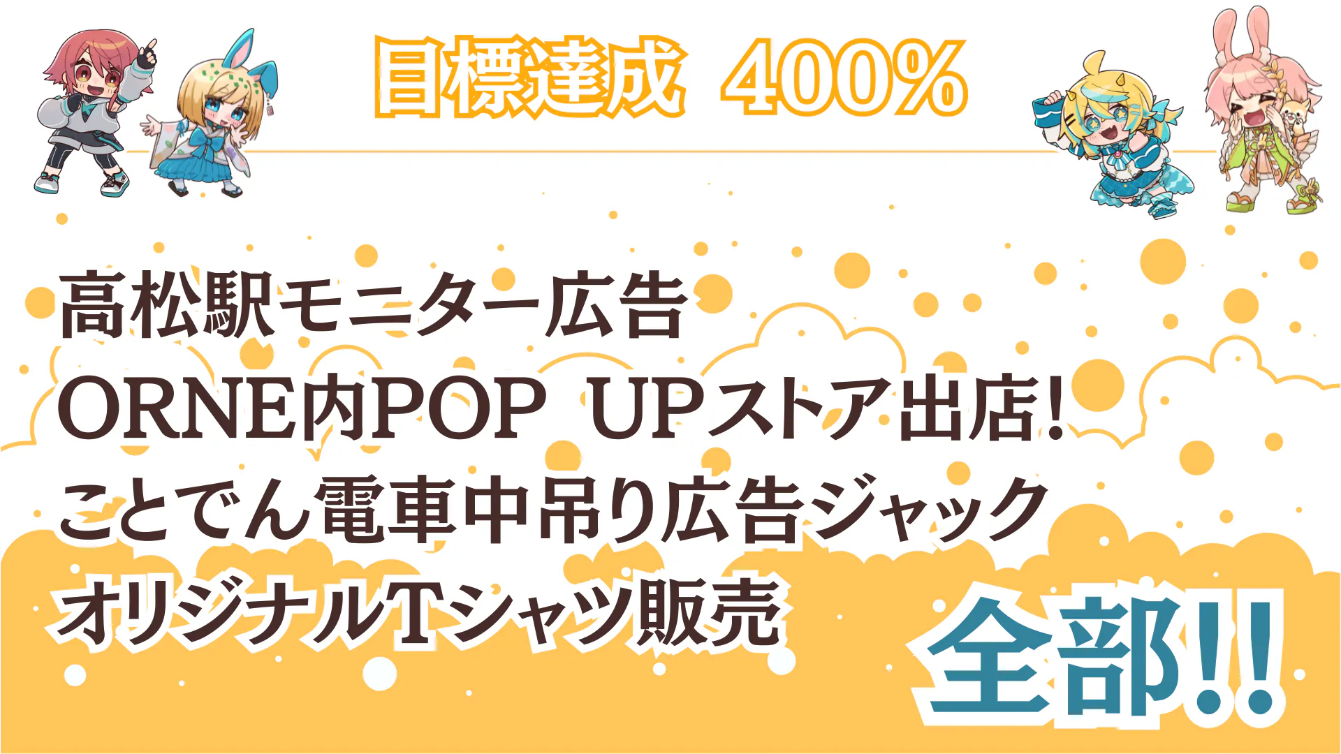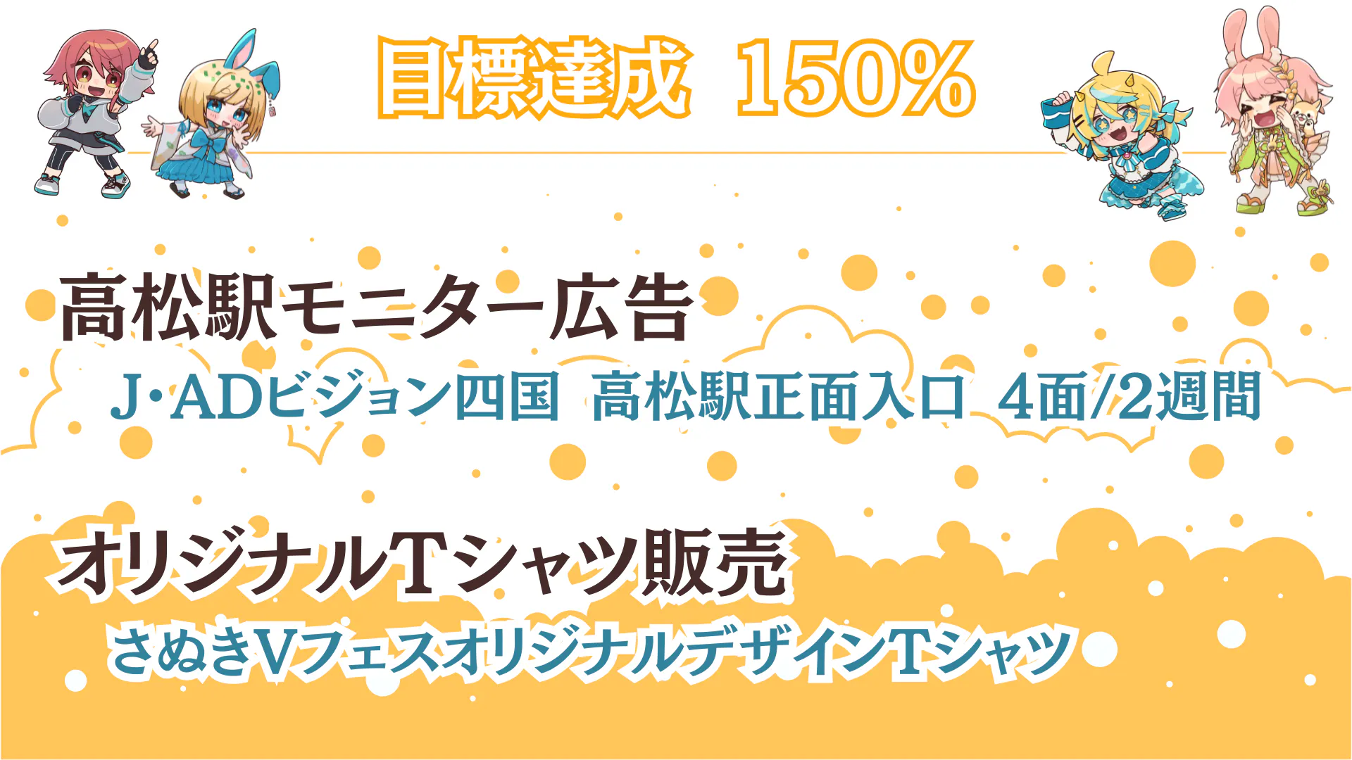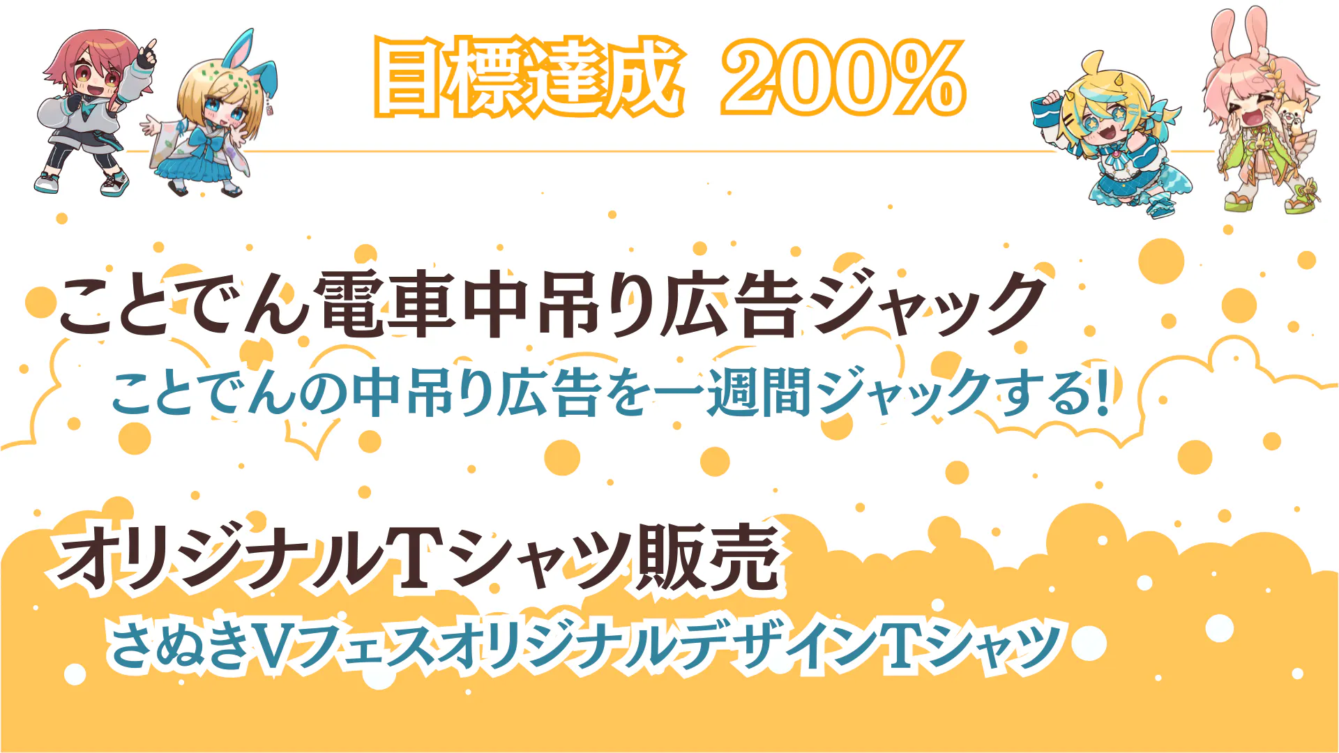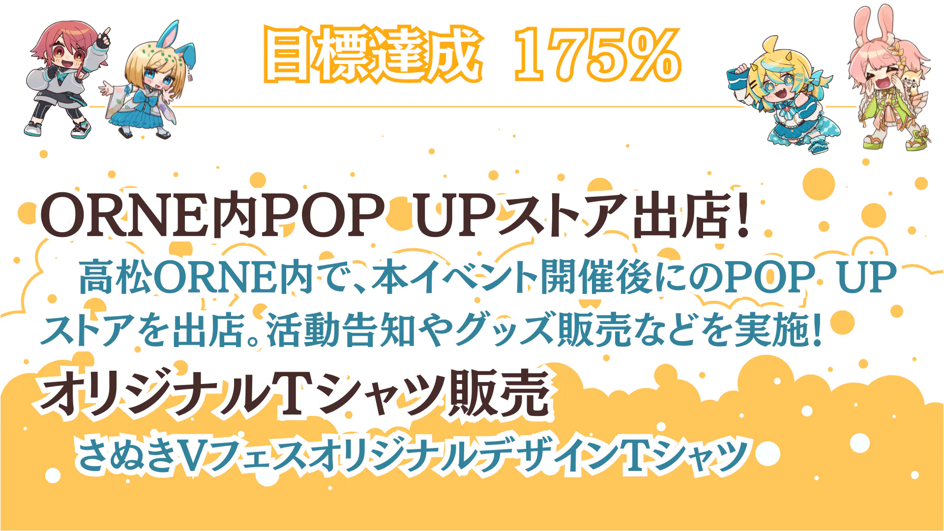 2025/07/21 12:00達成報告!そして新たなスタートを!7月19日の夜22時~24時30分頃、クラファン最終日の見守り配信をアンバサダー4名で行いました。驚いたことに、早々に150%を達成!その後175%も達成!そして、「決済間に合わなかったー!」という断末魔コメントに笑いながら、無事187%達成でクラファンが終了しました。応援してくださった方の「記念撮影を」というご希望もいただき、みんなニコニコでスクリーンショットタイムを作りまして、SNSに投稿してくださった中の一枚をお借りしました。配信中にはみんながそれぞれコメントをしてくれているので、ぜひそちらもご確認ください!【さぬきVTuberフェス】告知配信Vol.5「最終日見守り配信」最後の最後まで一緒に頑張ってくださった皆様本当にありがとうございました!また、今回の配信に合わせて、八夜水ちゃんのイラストを活用して、さなかさなかちゃんがデザインしてくれたポスターを公開しました(^^)/配信中には、素敵なポスターのデザインについても思いを語ってくれています。ぜひご視聴ください。さて、ここから先のお話!【ポスターについて】既にポスターを貼ってくださる場所が名乗りを上げてくださっていらっしゃいます。ポスターに関しても折角なら何か企画が出来たらと思っております。そちらの企画もお楽しみに\( *´ω`* )/今後も「ポスターうちでも貼ったるで!」「貼れるか聞いてみるで!」という方を、県内外問わず広く募集しております。お気軽にご連絡ください(*'▽')ノ~【返礼品(リターン)について】有難いことにみんなの活動がそれぞれに忙しくなり始めておりまして、支援者様限定の「お礼動画」は8月に入ってからお送りする流れとなります。また、缶バッジやクリアファイルなどデザインが必要なものに関しまして、なるべくアンバサダーみんなで気持ちを込めて作りたいと考えています。今後、各自の配信などでデザインを取り上げたものも出てくると思うので、お楽しみに! 〇アンバサダーのYouTubeチャンネルはこちら!(敬称略・五十音順) ・饂飩之ミコ(うどんのみこ) ・さなかさかな ・瀬戸兎ゆめ(せとうさゆめ) ・八夜水(やつよすい)【こんぴらおさんぽツアーについて】今回、株式会社地方創生さまのご協力をいただきまして、こんぴらで「地域を盛り上げよう!」と面白い事業をしている事業者さんを訪ね歩きながらこんぴらを満喫するツアーを実施します\( *´ω`* )/撮影したものは、瀬戸兎のチャンネルで公開し、当日も会場で流す予定です。そちらもお楽しみにっ!クラウドファンディングは終わりましたが、10月19日に向けてまだまだ企画は盛りだくさんっ!地域や応援者さんたちをどんどん巻き込む企画を考えているので、引き続き巻き込まれていただく準備をお願いします!⁽⁽٩(◍˃ᗜ˂◍)۶⁾⁾ もっと見る