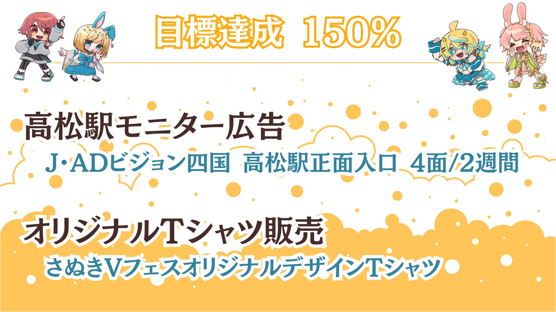2025/07/21 12:00達成報告!そして新たなスタートを!7月19日の夜22時~24時30分頃、クラファン最終日の見守り配信をアンバサダー4名で行いました。驚いたことに、早々に150%を達成!その後175%も達成!そして、「決済間に合わなかったー!」という断末魔コメントに笑いながら、無事187%達成でクラファンが終了しました。応援してくださった方の「記念撮影を」というご希望もいただき、みんなニコニコでスクリーンショットタイムを作りまして、SNSに投稿してくださった中の一枚をお借りしました。配信中にはみんながそれぞれコメントをしてくれているので、ぜひそちらもご確認ください!【さぬきVTuberフェス】告知配信Vol.5「最終日見守り配信」最後の最後まで一緒に頑張ってくださった皆様本当にありがとうございました!また、今回の配信に合わせて、八夜水ちゃんのイラストを活用して、さなかさなかちゃんがデザインしてくれたポスターを公開しました(^^)/配信中には、素敵なポスターのデザインについても思いを語ってくれています。ぜひご視聴ください。さて、ここから先のお話!【ポスターについて】既にポスターを貼ってくださる場所が名乗りを上げてくださっていらっしゃいます。ポスターに関しても折角なら何か企画が出来たらと思っております。そちらの企画もお楽しみに\( *´ω`* )/今後も「ポスターうちでも貼ったるで!」「貼れるか聞いてみるで!」という方を、県内外問わず広く募集しております。お気軽にご連絡ください(*'▽')ノ~【返礼品(リターン)について】有難いことにみんなの活動がそれぞれに忙しくなり始めておりまして、支援者様限定の「お礼動画」は8月に入ってからお送りする流れとなります。また、缶バッジやクリアファイルなどデザインが必要なものに関しまして、なるべくアンバサダーみんなで気持ちを込めて作りたいと考えています。今後、各自の配信などでデザインを取り上げたものも出てくると思うので、お楽しみに! 〇アンバサダーのYouTubeチャンネルはこちら!(敬称略・五十音順) ・饂飩之ミコ(うどんのみこ) ・さなかさかな ・瀬戸兎ゆめ(せとうさゆめ) ・八夜水(やつよすい)【こんぴらおさんぽツアーについて】今回、株式会社地方創生さまのご協力をいただきまして、こんぴらで「地域を盛り上げよう!」と面白い事業をしている事業者さんを訪ね歩きながらこんぴらを満喫するツアーを実施します\( *´ω`* )/撮影したものは、瀬戸兎のチャンネルで公開し、当日も会場で流す予定です。そちらもお楽しみにっ!クラウドファンディングは終わりましたが、10月19日に向けてまだまだ企画は盛りだくさんっ! 地域や応援者さんたちをどんどん巻き込む企画を考えているので、引き続き巻き込まれていただく準備をお願いします!⁽⁽٩(◍˃ᗜ˂◍)۶⁾⁾ もっと見る