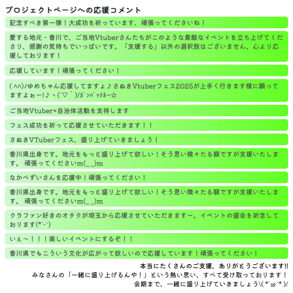 2025/06/18 19:00-目次-1)香川県内の全自治体へのご協力依頼が完了しました!2)いただいた応援メッセージ・コメントを追加しました!3)6/20のクラファン告知配信枠を作成しました!4)各アンバサダーの活動報告---------------------------------------------1)香川県内の全自治体へのご協力依頼が完了しました!本日、香川県内の全自治体へのご協力依頼が完了しました。6月中にご回答をいただき、7月頭にはご参加いただける自治体紹介をいたします!2)いただいた応援メッセージ・コメントを追加しました!プロジェクトページに、いただいた応援メッセージ・コメントを掲載しました。実行委員・アンバサダー共に、とても励まされております(TДT)随時、いただいたものを追加してまいります!3)6/20のクラファン告知配信枠を作成しました!もともとプロジェクトスタートを予定しておりました6月20日に、このプロジェクトのご説明をする配信を予定しております。コメント欄で疑問点や質問なども受け付けてますので、お気軽にコメントしていただけると嬉しいです!(ご挨拶のみや応援のみのコメントも大歓迎です!)新情報も、ある…かも!?!?【さぬきVTuberフェス】告知配信Vol.3「クラファンスタートっ!」 日時:2025年6月20日(金) 22:00~23:00 場所:YouTube(瀬戸兎ゆめのチャンネル)4)各アンバサダーの活動報告<饂飩之ミコ> X・YouTube・瀬戸内リゾート ベッセルおおちさまに、フライヤーを設置! 行かれるご予定のある方は、ぜひ貰ってください⁽⁽٩(◍˃ᗜ˂◍)۶⁾⁾<さなかさかな> X・YouTube・チャンネル登録者数年内目標700人に配信を継続中。 修羅場を乗り切ったとのことで、配信も増えそうで楽しみです\( *´ω`* )/<八夜水> X・YouTube・6月15日にRe:デビュー配信を行いました!3Dすごい…! つよつよになってRe:デビュー!ここからまたよろしくねの記念配信・Re:デビュー配信後、配信スケジュールも公開中。チェック!<瀬戸兎ゆめ> X・YouTube・個人企画で「さぬきVフェスまでにチャンネル登録者数2000人を目指すショート動画毎日投稿」企画を行っております!ぜひチェックを!引き続き、拡散にご協力いただけますと、大変ありがたいです!何度でもシェアしていただき、まだこのイベントを知らない方へ情報をお届けするお手伝いを、ぜひともお願いいたします!さぬきVTuberフェス実行委員長 瀬戸兎ゆめ もっと見る