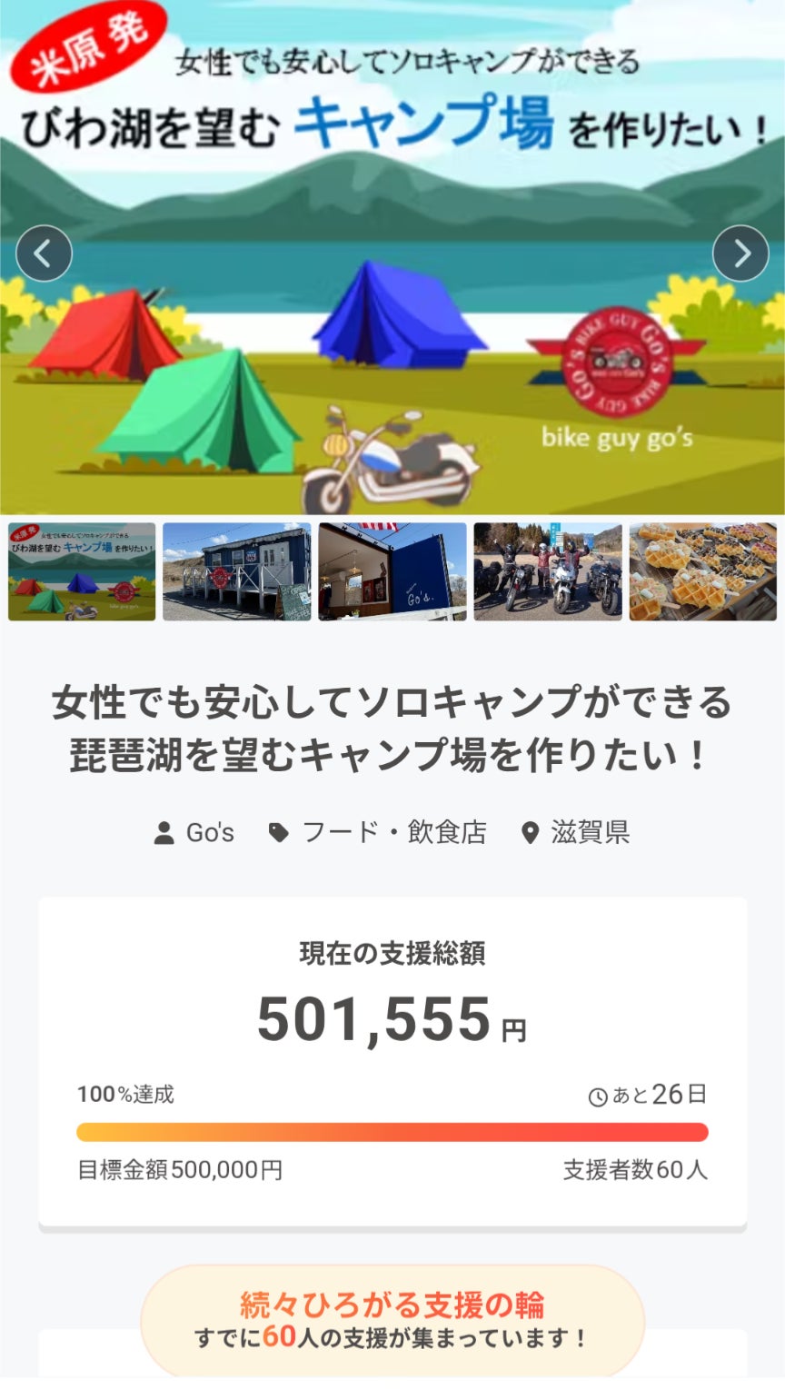 2025/08/30 09:35早くも皆様のお陰で、目標の50万円を達成出来ました。本当に本当にありがとうございました。まだ日にちは残っておりますので頑張りたいと思います。キャンプ場完成致しましたら、ぜひぜひ皆様遊びに泊まりに来て下さいませ。心よりお待ちしております。皆様のお心に感謝申し上げます。 もっと見る