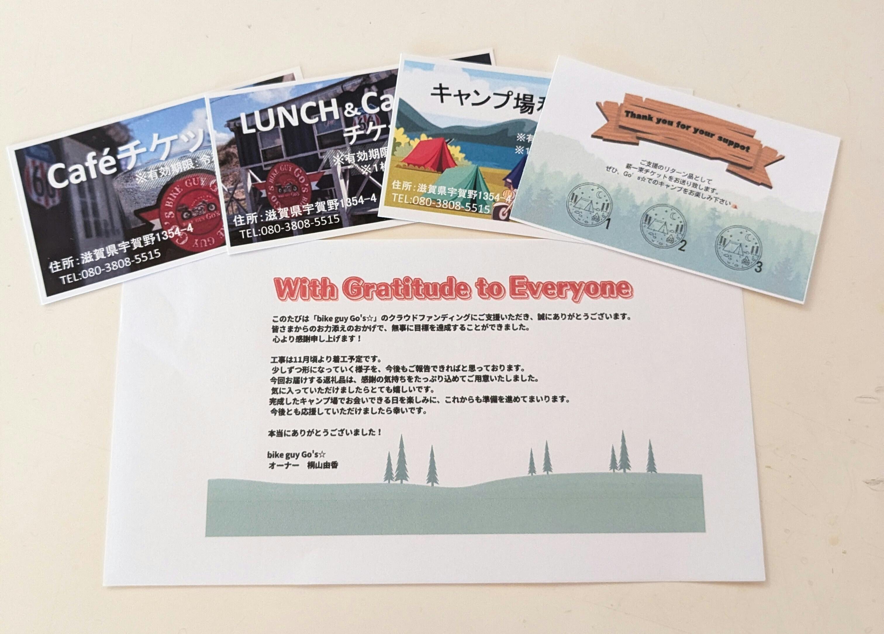 ●完成したキャンプ場の利用券、カフェチケット、地元のお米などをご用意いたしました!