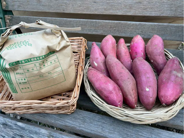 旬のサツマイモ「紅はるか」(3kg)と新米をお届けいたします。
