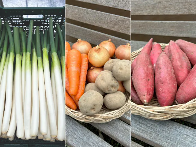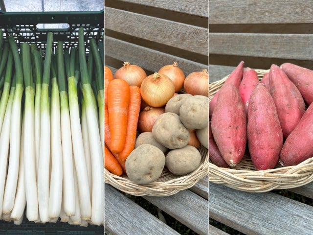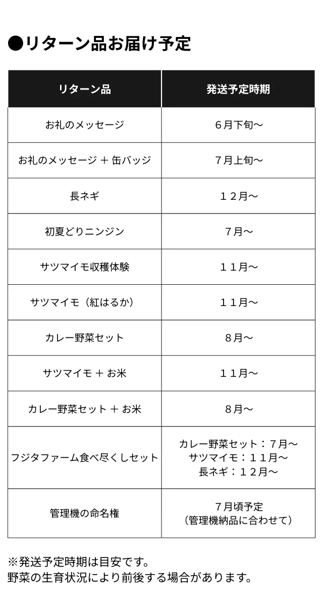 カレー野菜セット(7月)、サツマイモ(10月)、長ネギ(12月)を収穫時期に合わせて順次お届けいたします。