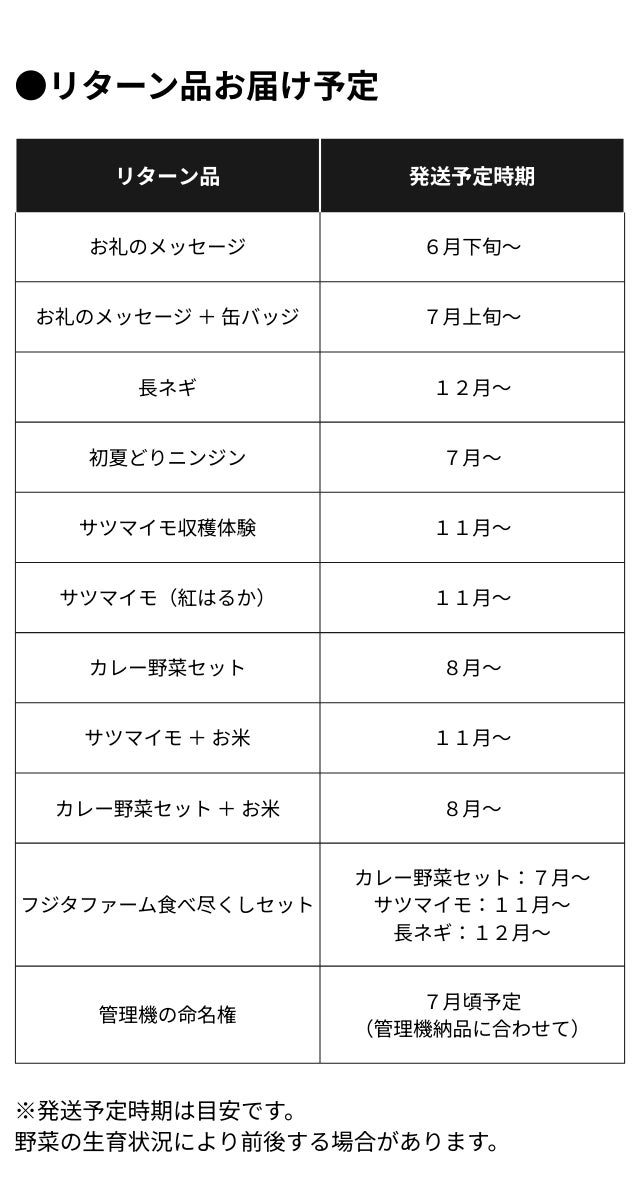 今後、リターンの発送に向けた準備、収穫イベントに向けた会場の設営、ふるさと納税の返礼品に至るまでの仕組みづくりを行ってまります。みなさまの喜ぶ姿を想像しながら鋭意準備を進めております。