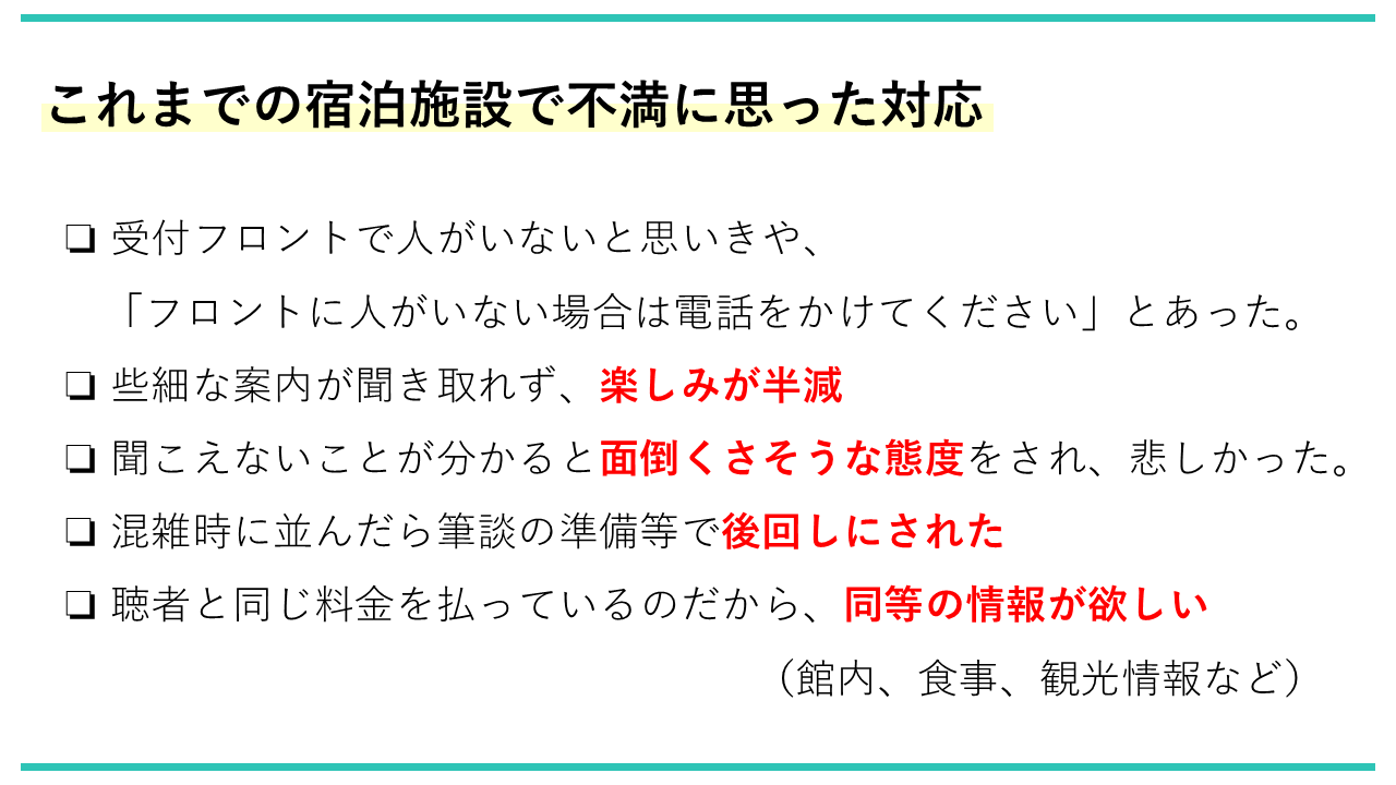 その他、手話で対応できる宿が欲しいといったコメントが多数ありました。