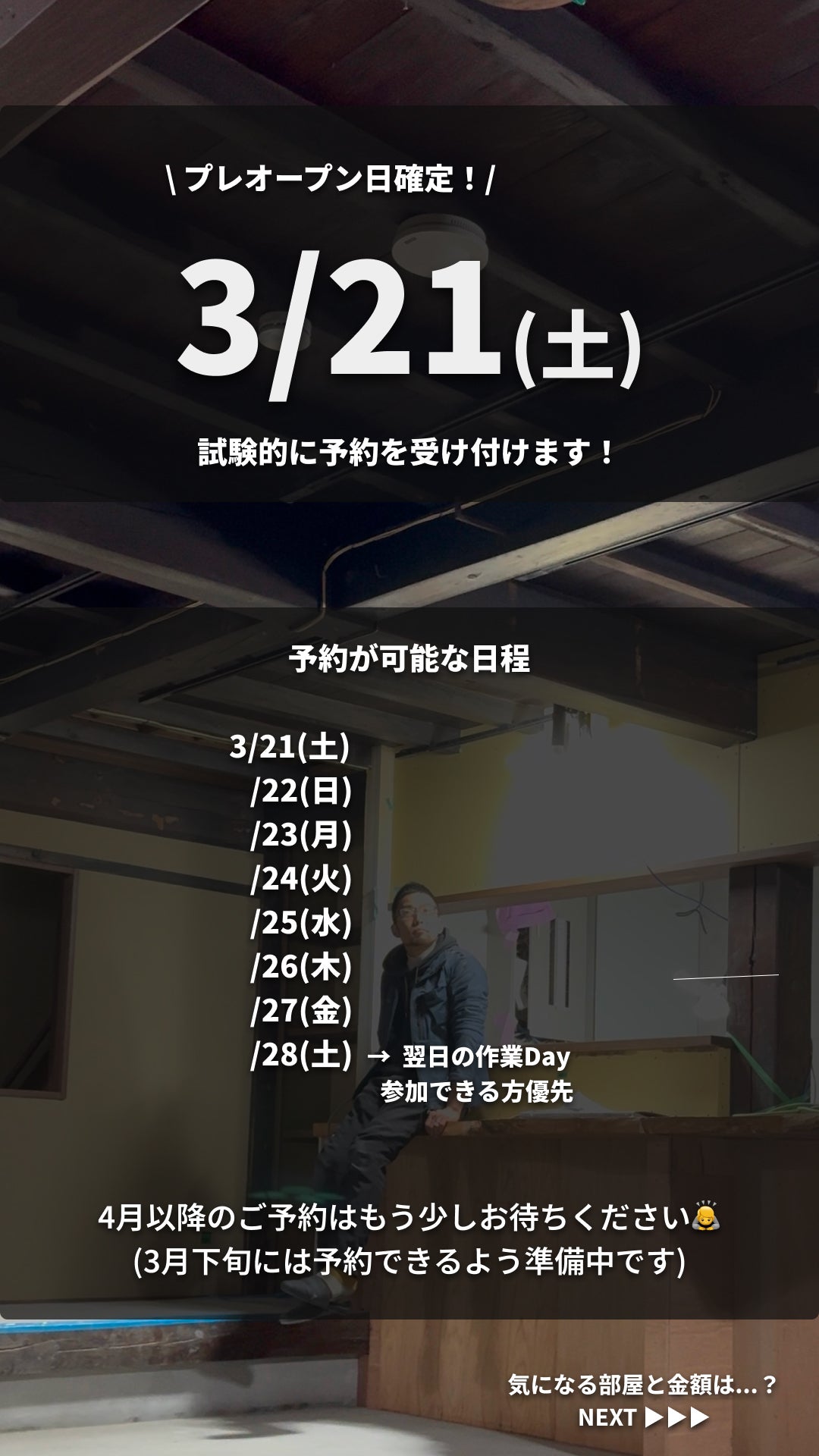 2026/03/06 18:00長らくお待たせしてしまいましたが…ついに、プレオープンします!! ようやく建物の引き渡しを終え、そして無事に旅館業法の宿泊営業許可もおりました。本当に、ここまで長かった…。当初は9月オープンの予定だったのですが、工事や準備などが重なり、延びに延びてしまい…それでもようやく、3月21日(土)にプレオープンできることになりました!ひとまず試験的に、3月については3月21日(土)〜28日(土) の営業とします。プレオープン自体の期間はまだ決めておりませんが、1〜2ヶ月のプレオープン期間となりそうな予感です。今回は大きな告知はせず、これまで応援してくださった・Instagramのフォロワーさん・CAMPFIREで支援してくださった皆さんを中心に、先行してご案内させていただきます。この期間のご予約はサカナギゲストハウス公式LINEにて受付いたします。プレオープン期間中につき、以下の事情をご理解の上、ご予約をお願いします。 ・設備や運営に改善途中の部分があること ・DIYの途中箇所があること ・お気づきの点がありましたら、ご意見をお聞かせいただけると嬉しいです※LINEでお送りいただいた時点では予約確定ではありません。 空室確認後、こちらから返信をもって予約確定となりますのでご注意ください。詳細は、以下の画像をご確認ください。なお、4月以降のご予約につきましては、現在予約管理システムを構築中です。3月下旬頃にはお知らせできる予定ですので、もう少しだけお待ちいただけると嬉しいです。やっとここまで来ました。まだまだ整っていないところもあるかもしれませんが、少しずつ、みんなで育てていける場所になったら嬉しいです。正直、まだバタバタしてます。笑でも、やっと皆さんを迎えられるところまで来ました。これもみなさまからのご支援のおかげです。本当にありがとうございました。まずはプレオープン、お待ちしています! もっと見る