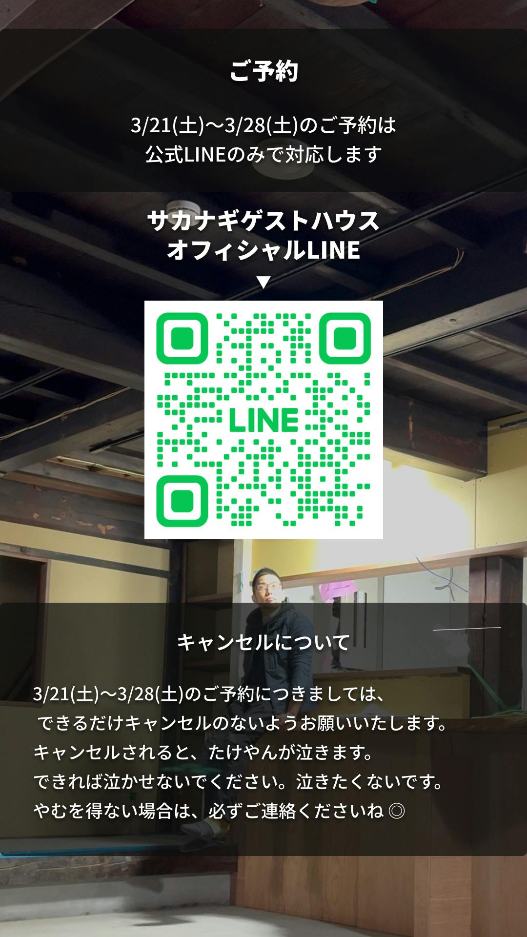 この期間のご予約はサカナギゲストハウス公式LINEにて受付いたします。