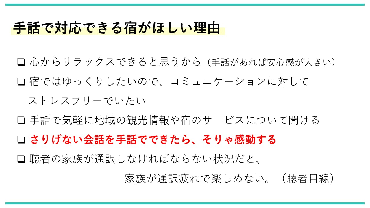 その他、手話で対応できる宿が欲しいといったコメントが多数ありました。