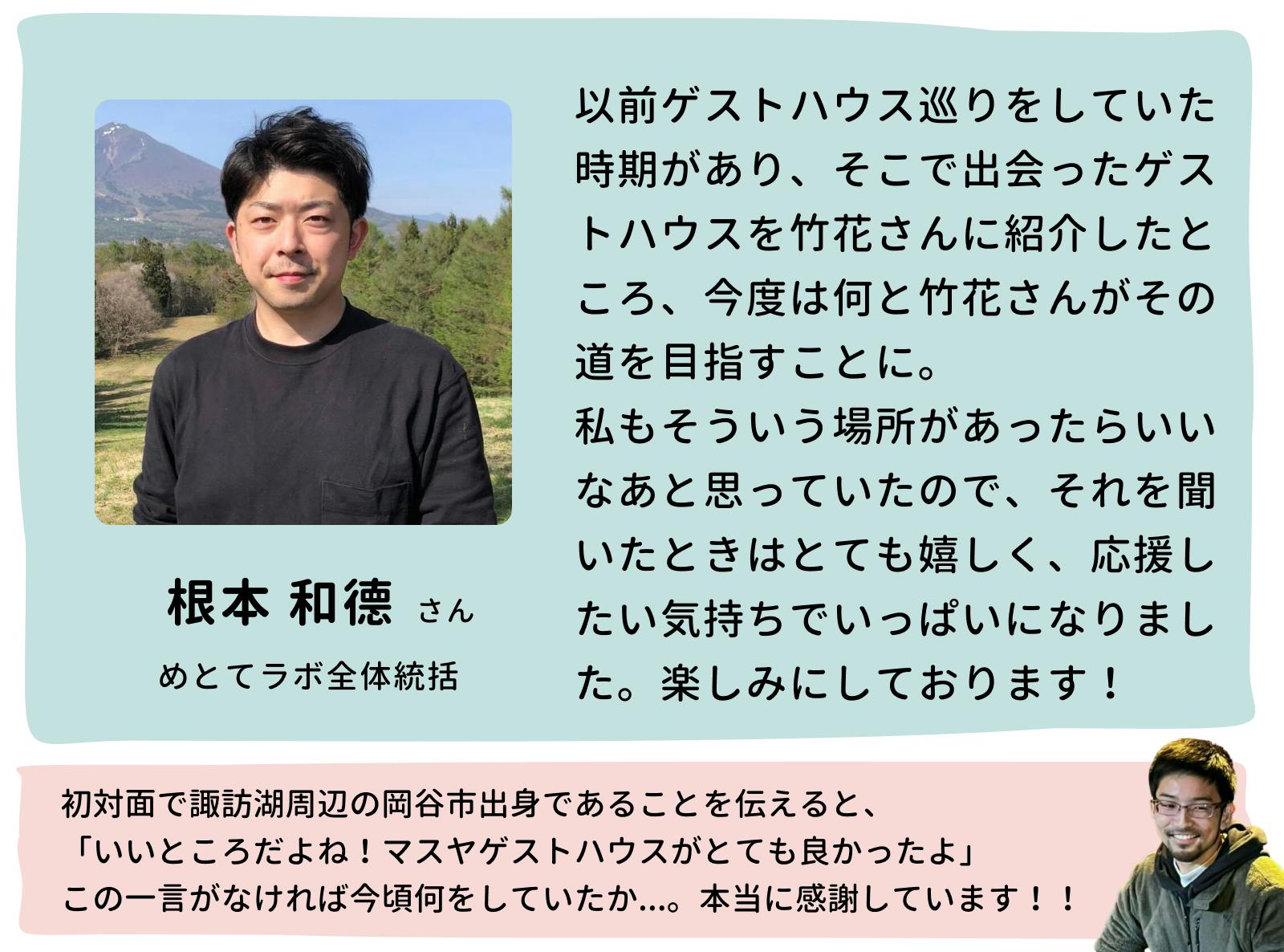 ゲストハウスに訪れた方々には、地元民ならではの情報を提供することで暮らすように旅をする、そんな長野の滞在を存分に満喫していただけたらいいなと思っています。