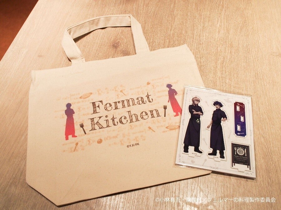 中央には「Fermat Kitchen」のロゴと、岳と海のシルエットをデザイン。背景には数式や料理モチーフを散りばめ、遊び心をプラスしました。お弁当や軽いお出かけにぴったりのサイズ感です!