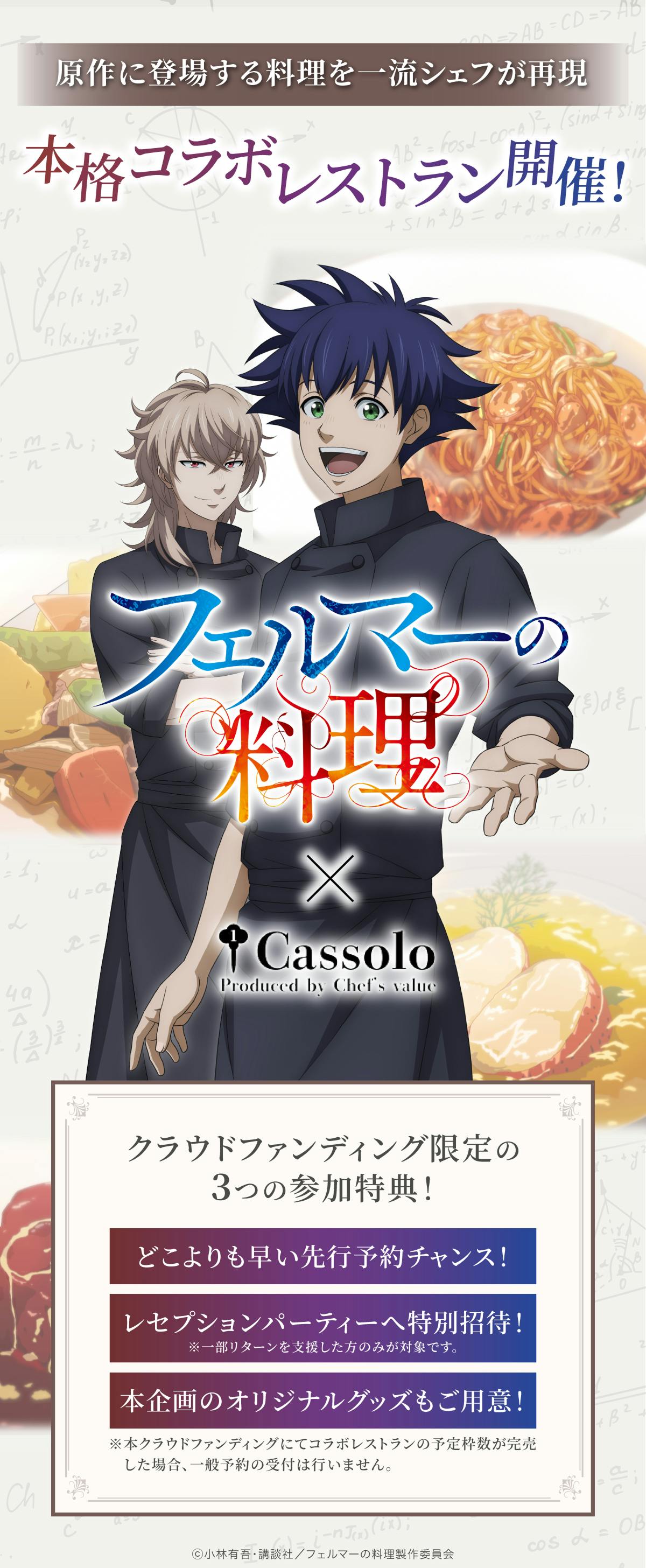 人気アニメ「フェルマーの料理」コラボレストラン企画が始動!コラボの舞台は東京・新橋のレストラン「Cassolo」。ナポリタンをはじめとする原作屈指の料理を一流シェフが再現。クラファンでは先行予約に加えて、レセプションパーティー参加券やオリジナルグッズも登場!一緒にコラボを盛り上げよう!