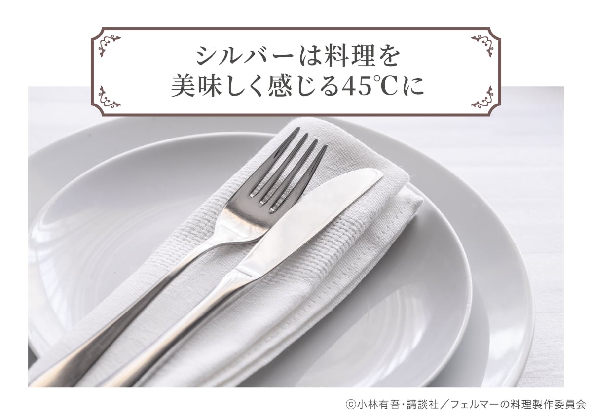 原作でも印象的だった、フォークの温度。岳のお店では当然これは外せないだろうと思い、再現を決めました。洋食を食べる時、岳にとっては当たり前のことだった「熱い」⁨⁩と「温かい」の境目になる45℃のシルバーで食事をお楽しみください。