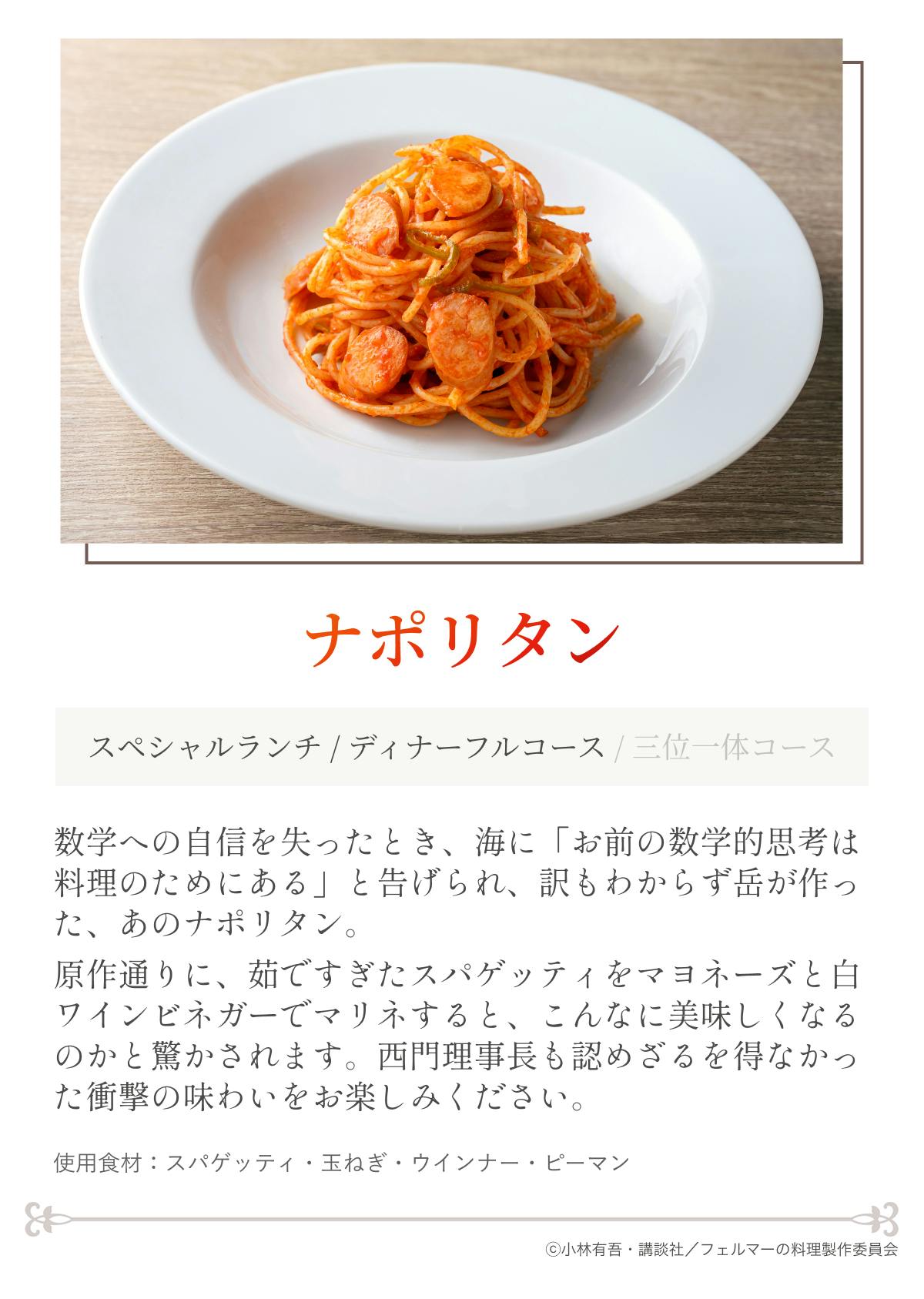 岳が作中で初めて振る舞った料理「ナポリタン」、初めて作った賄い「肉じゃが」、そして「苺のタルト」へと続くコース。Kに入りたての頃の岳に思いを馳せたくなる内容です。家庭料理の肉じゃがと洋食屋の定番であるナポリタンが、「フェルマーの料理」というフィルターを通すとどのように仕上がるのか─ぜひお楽しみください。