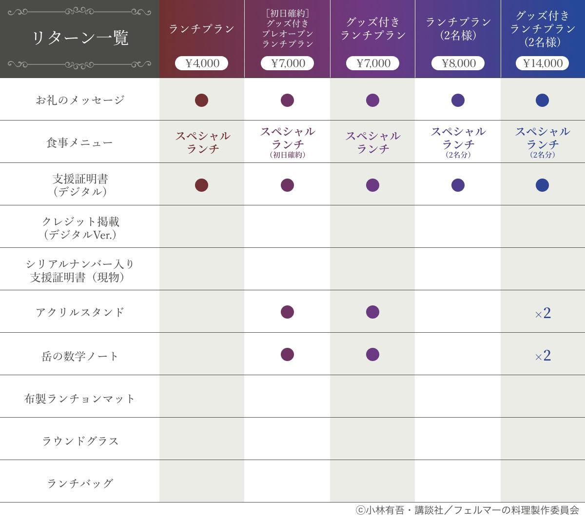 • \クラウドファンディング終了まであと3日/クラウドファンディングは11月30日(日)23:59まで!ここまで応援いただき本当にありがとうございます!  ラストチャンス、ぜひ人気リターンもご覧ください。01|スペシャルランチ岳が作中で初めて振る舞った料理「ナポリタン」、初めて作った賄い「肉じゃが」、そして「苺のタルト」へと続くコース。Kに入りたての頃の岳に思いを馳せたくなる内容です。家庭料理の肉じゃがと洋食屋の定番であるナポリタンが、「フェルマーの料理」というフィルターを通すとどのように仕上がるのか─ぜひお楽しみください。02|ディナーフルコース「ナポリタン」と「苺のタルト」に加え、神楽のために作った「包み揚げサンドイッチ」、父に振る舞った「トマトチーズ茶漬け」、そしてKで合格をもらった賄い「世界標準の肉じゃが」が味わえます。Kでの出来事だけでなく、友人や家族との記憶も思い出されるコースです。特に「世界標準の肉じゃが」は、国籍を問わず多くの方に味わっていただきたい一皿です。03| 三位一体コース楠瀬正美賞授賞式でのディナーをかけた勝負の場面で、岳が考案したあの3品を味わえるコース。「クスクスのタブレ」にスープを合わせた「イタリアのクスクス・トラパネーゼ」、そしてカツ丼を思わせるオリジナルディッシュ「スパイスとナッツのトンカツ」。異なる文化圏(中東・地中海・日本)を横断し、最終的にひとつの世界観へと収束する雰囲気を味わえます。今回のコラボメニューも、一流シェフ監修のもと、志高い料理人が手掛けます。高みを目指して挑戦を重ねる彼らの姿は、まさに数学的思考で自分なりの高みを目指す岳とも重なります。アニメ「フェルマーの料理」だからこそできる本格コラボレストランとなっております。クラウドファンディングの枠が残った場合には一般予約も予定していますが、価格は異なります。誰よりも早く、特別価格で体験できるのは今回のクラウドファンディングだけ!ぜひこの機会にご参加ください! もっと見る