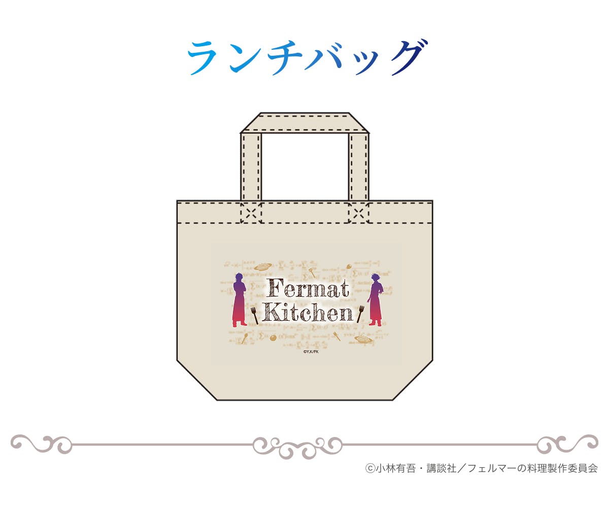 コラボレストラン企画オリジナルデザインのランチバッグです。中央には「Fermat Kitchen」のロゴと、岳と海のシルエットをあしらい、背景には数式や料理モチーフを散りばめました。お弁当や軽いお出かけにちょうど良いサイズ感です。
