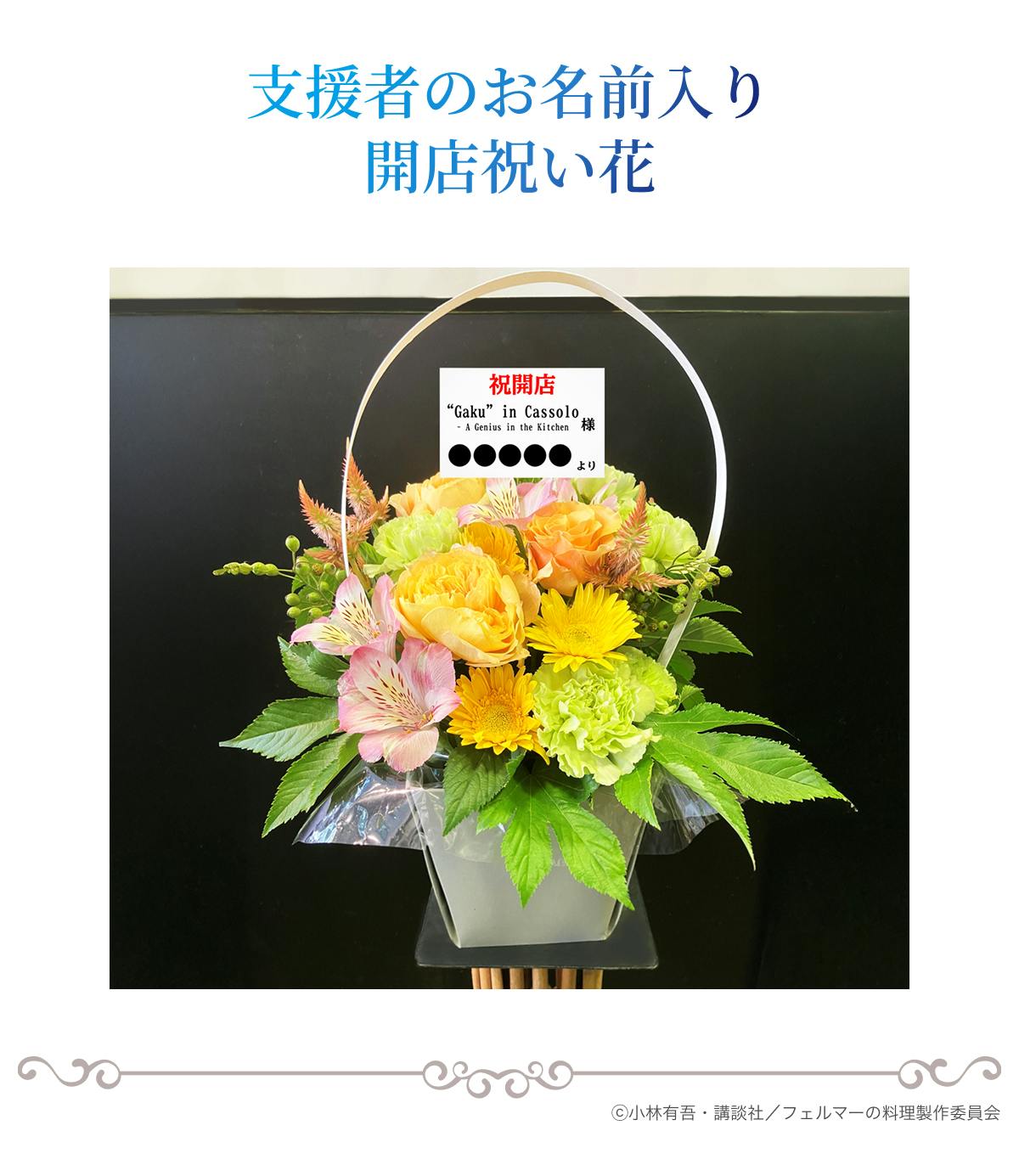 あなたのお名前入りの祝い花を、プレオープンの4/25から4/26までの2日間、店内に飾ります!レセプションパーティー終了後はお持ち帰りいただけますが、ご希望があればお店に置いていくことも可能です。その場合はお花の保存期間の都合上、4/29の営業終了後に回収いたします。回収後は、お名前のパネルのみ店内に掲示させていただきます。