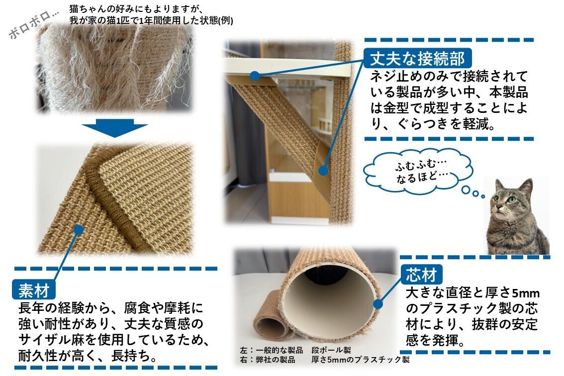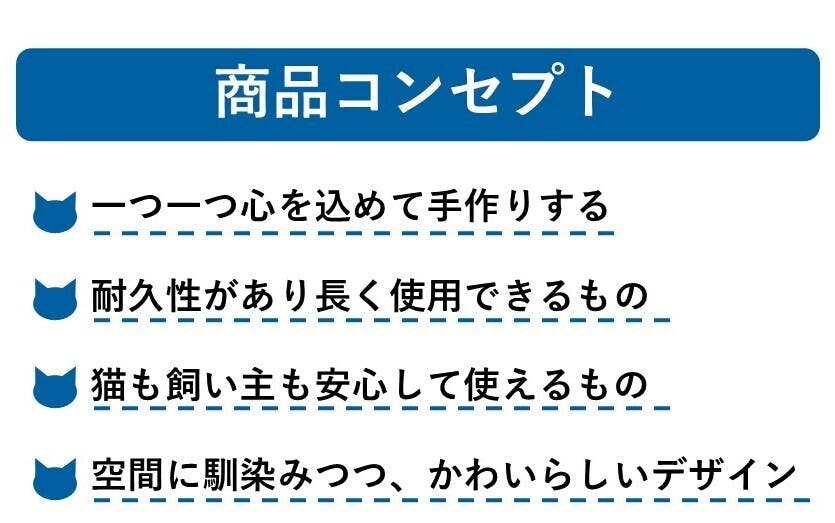 そこで「頑丈な作りで猫も飼い主も安心して長く使える製品を作りたい」という思いから、工場で1つ1つ手作りし、本製品を作成しました。