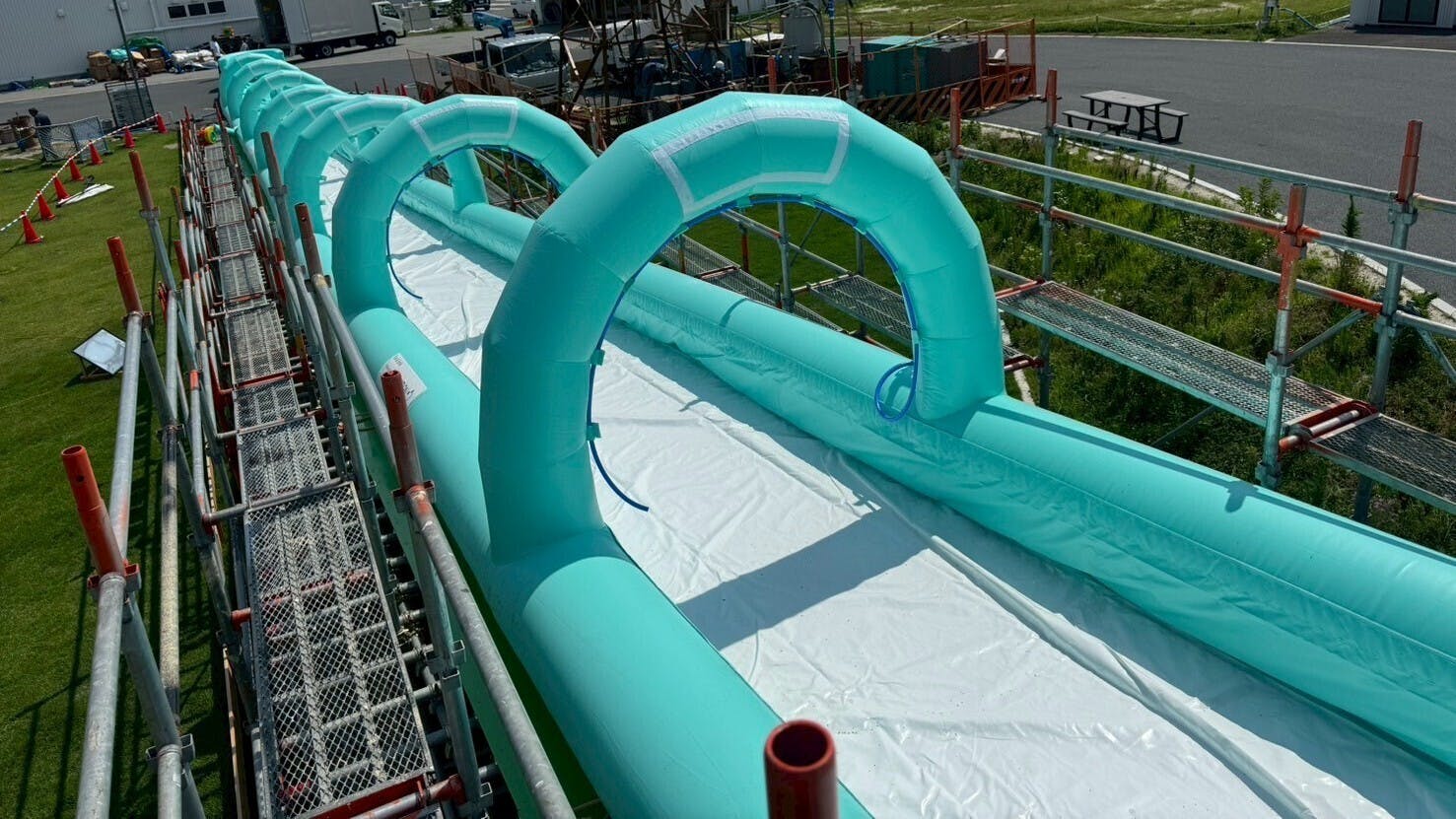 まだまだ仮設感ありますが、これが浮き輪に乗って滑ってみると気持ちいいんです!