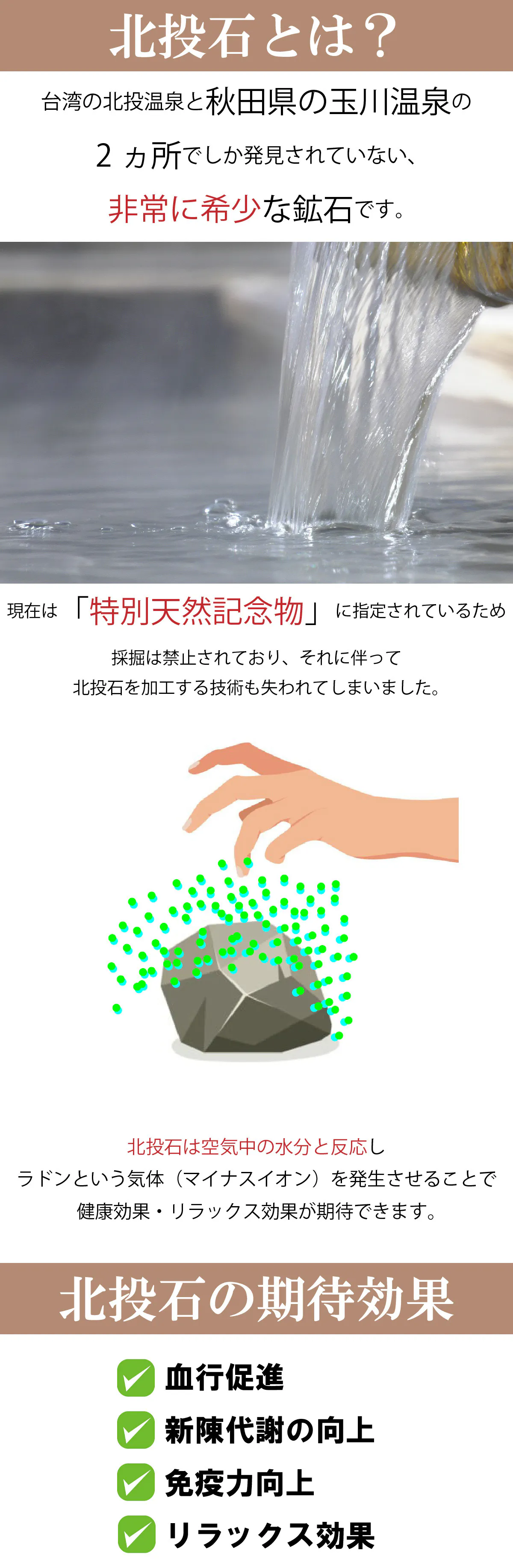 岩盤浴に使用される鉱石ではマイナスイオン放出量の多い「秋田県・玉川温泉 北投石」を使用されることが多くこの鉱石は1952年にその希少性から「特別天然記念物」に指定されました。