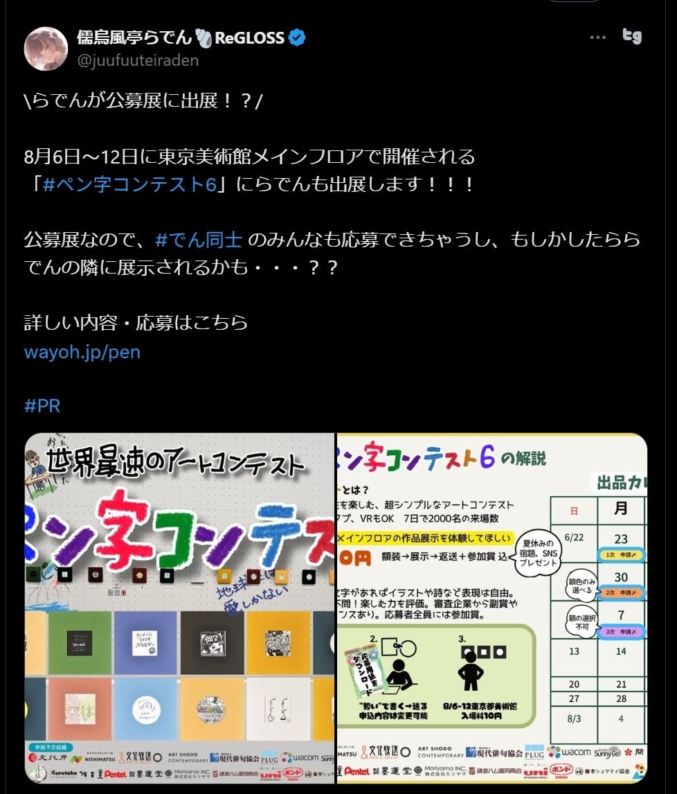 2025/06/28 14:45 手書き文字はエンタメだ!#ペン字コンテスト6 を応援してくれてありがとうございます。作品がどんどん届いています。念の為ですが①申し込み〆切 ←最優先 作品の額の製造開始の合図②作品送付(必着) ←①で申請したタイトルなどは②まで編集可能2つの〆切があります。ちょっとややこしくて申し訳ないのですが、額が受注生産状態なので、額のオーダーが先に必要なのです(後半は見込み発注するんで、徐々に選べなくなるんですよね)。2次申請〆切 6/30なので、皆さん奮ってご応募ください! もっと見る