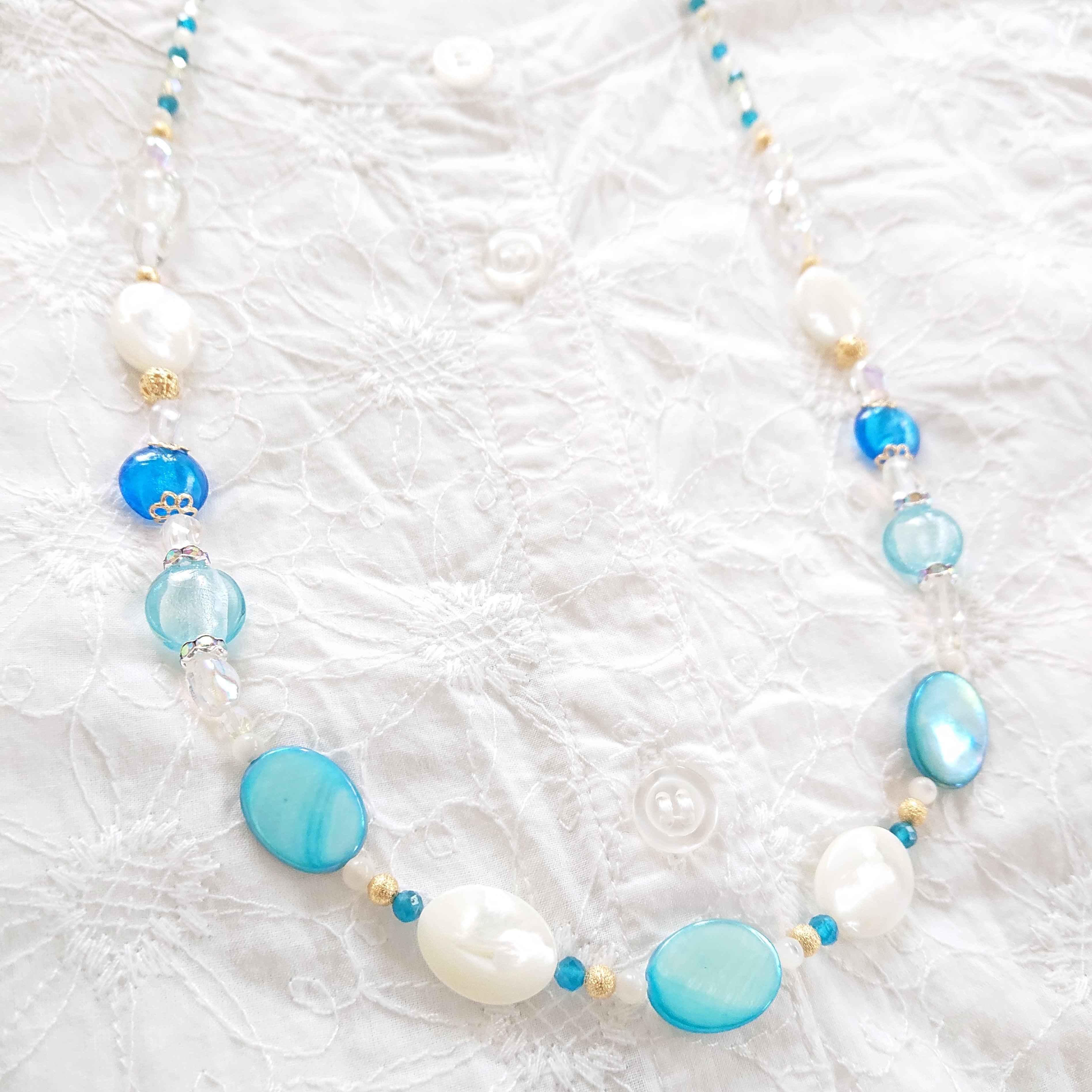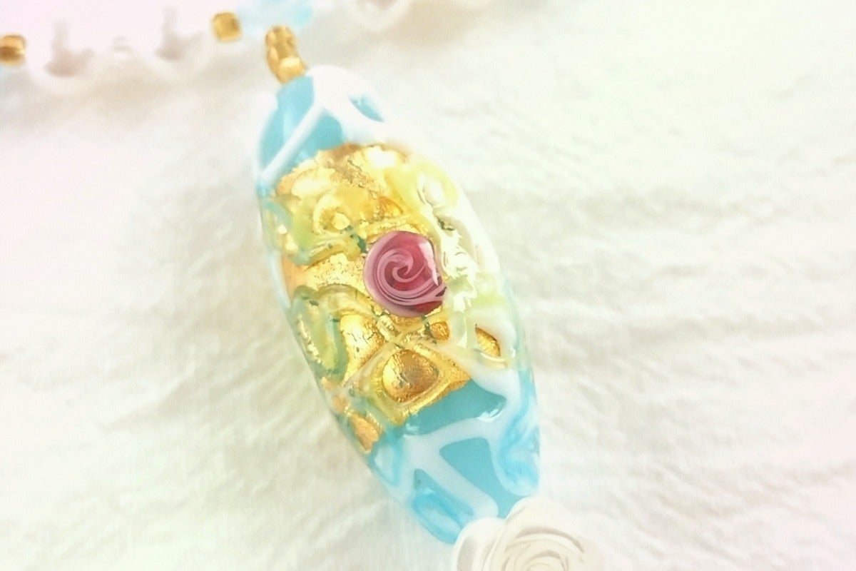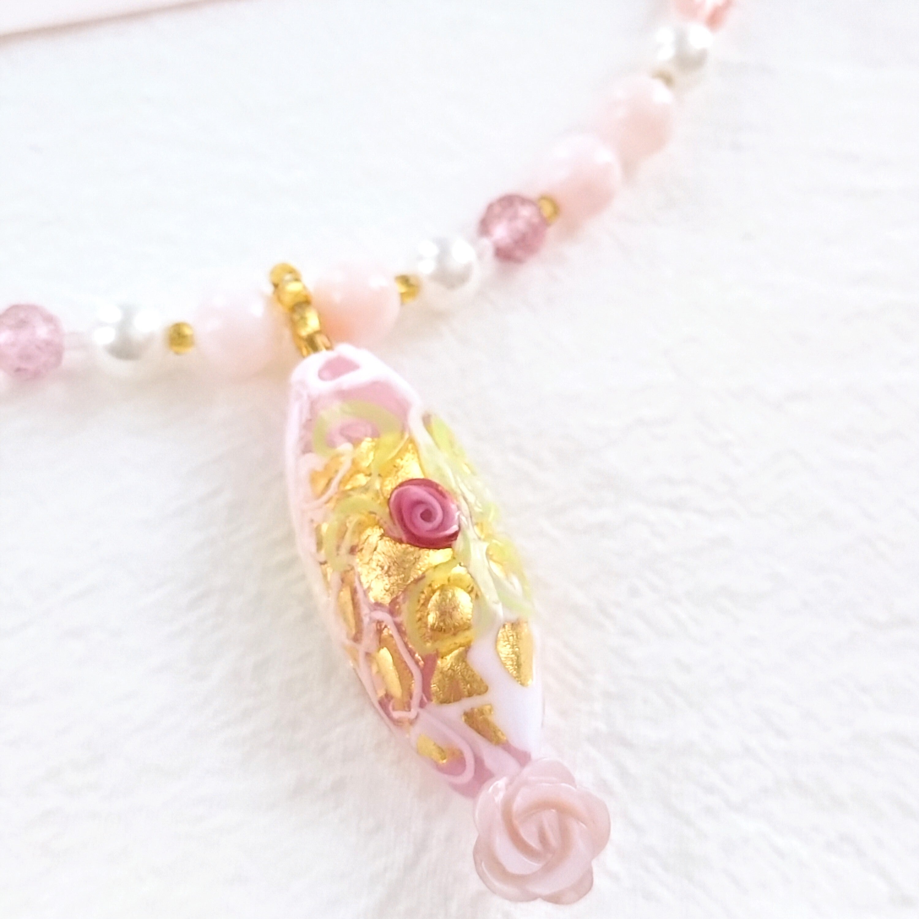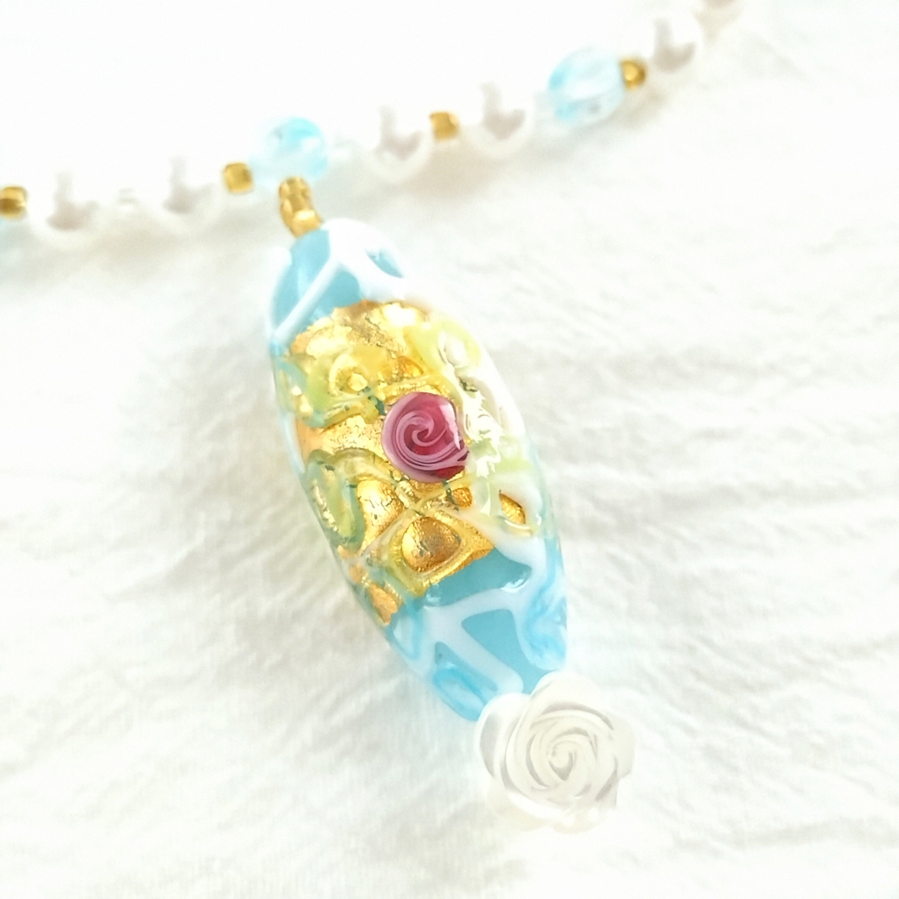 お写真は、ヴェネチアの伝統ある工房から取り寄せられたビーズを使いネックレスを手作りしたものです。