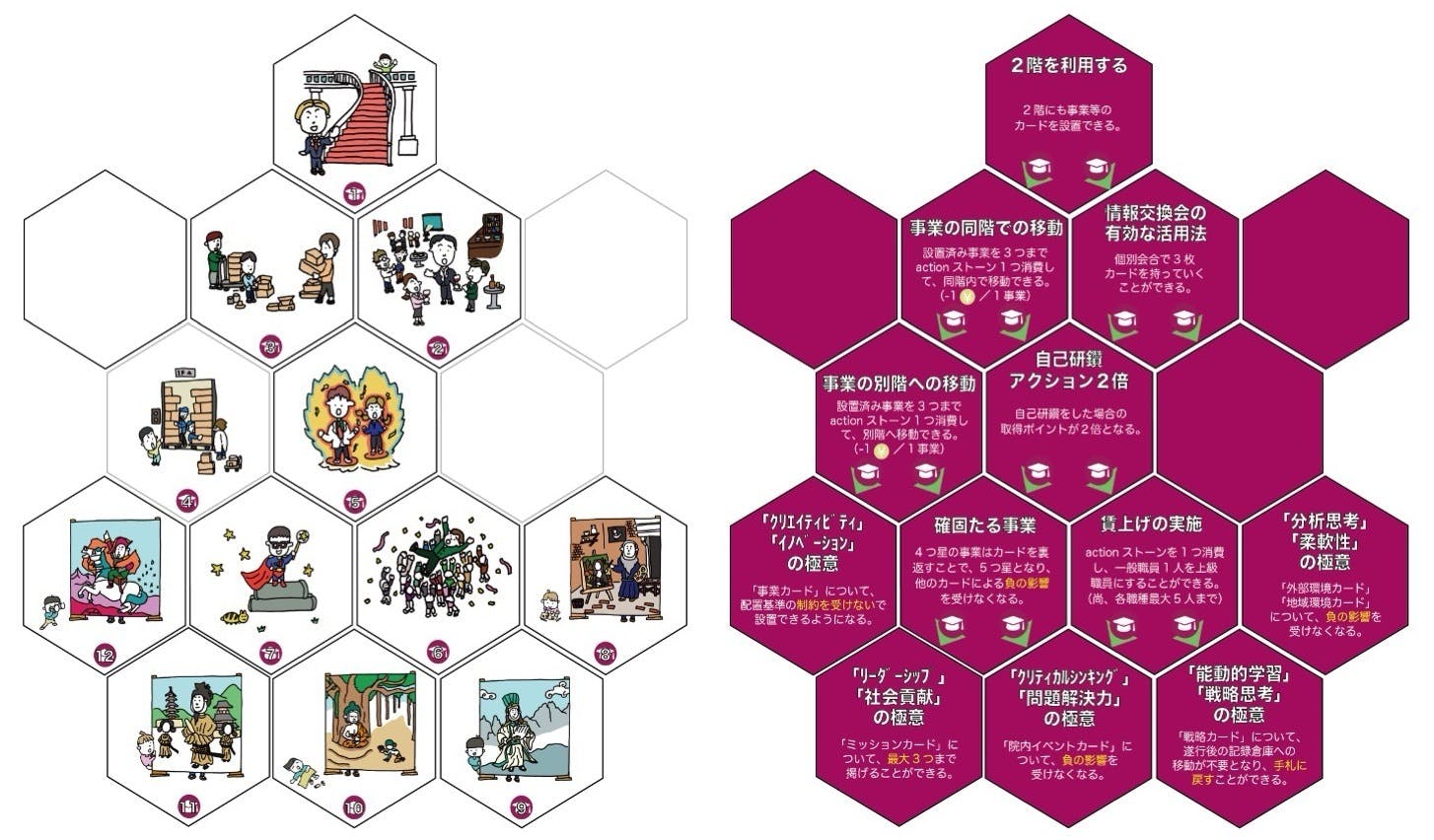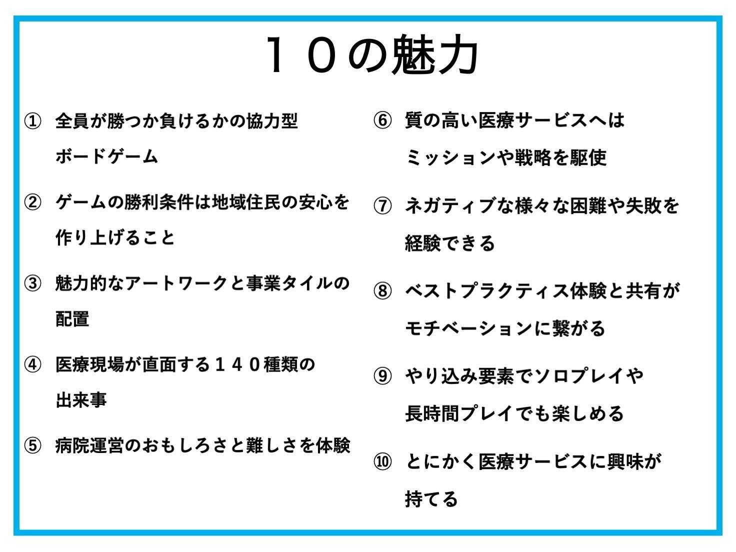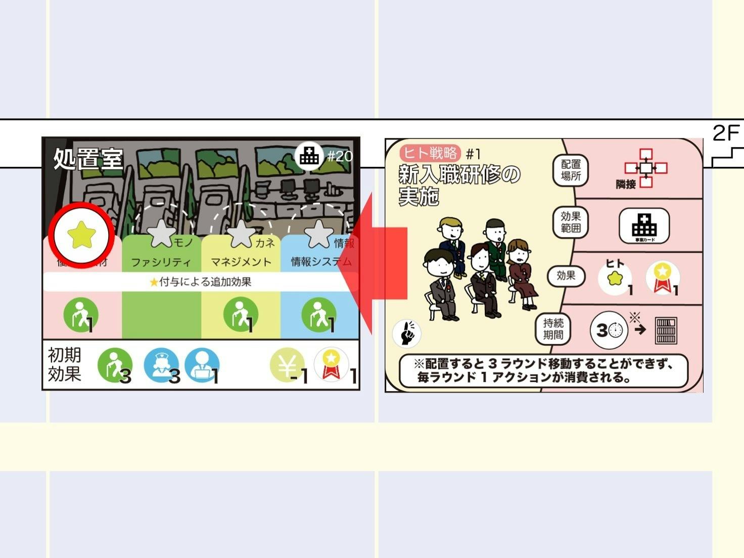 プレイヤーは診察室や検査室などの事業タイルを院内に配置することで、世界に1つのオリジナルな病院を作ります。それらの事業はミッションカードや戦略カードを配置することで、ヒト・モノ・カネ・情報のいずれか又は複数に⭐️を付与し、質を高めることができます。また、1つ1つの積み重ねが医療機関全体の評判に繋がります。ゲームを通して、医療の質を上げていく活動(医療マネジメント)のベースを学ぶこともできます。