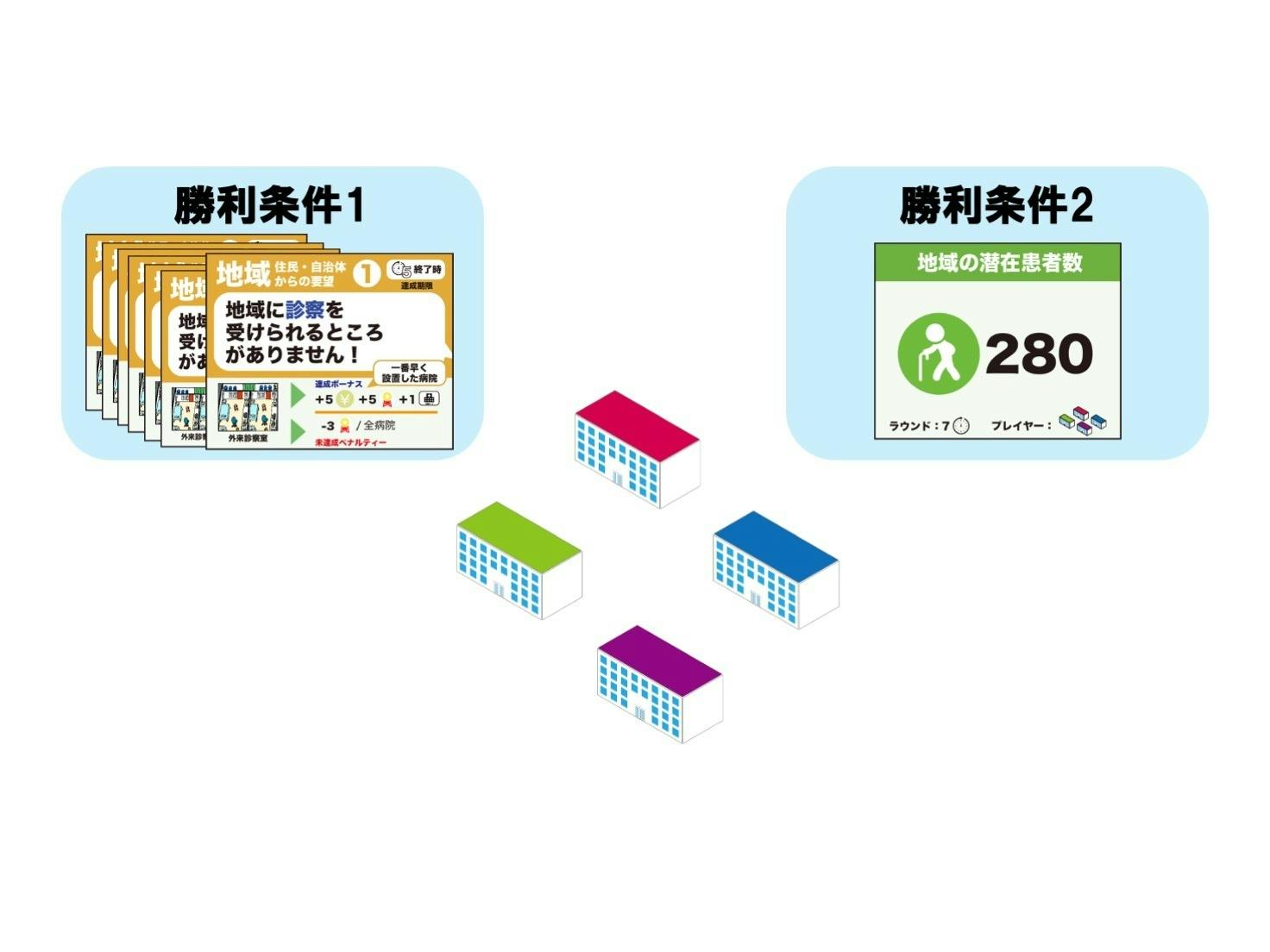 ゲームに勝利するためには、2つの勝利条件を満たす必要があります。 1つは「地域住民からの要望の8割に応えること」です。 もう1つは「地域に潜在する患者の8割を受け入れること」です。 これらの条件を全プレイヤーで協働して達成を目指します。 リアルな地域課題をゲームの中で感じ取り、地域医療の大切さと医療機関の役割分担を知ることができます。