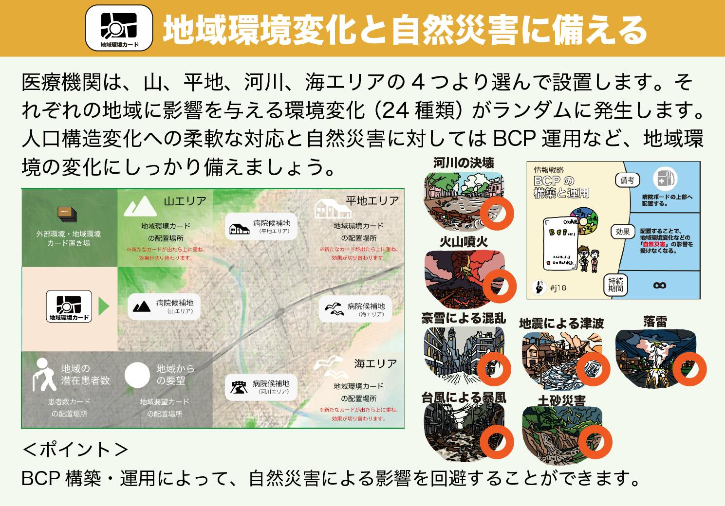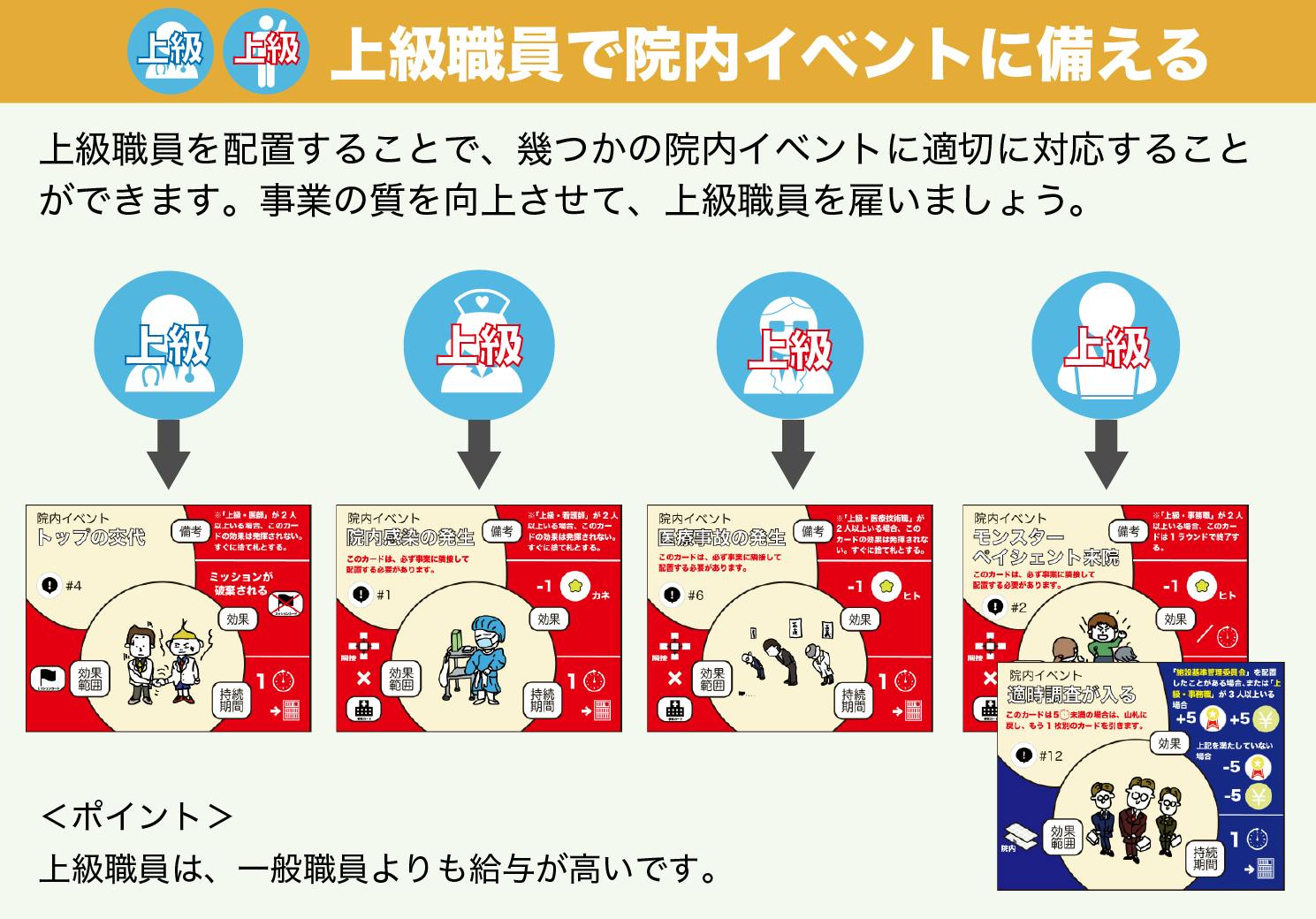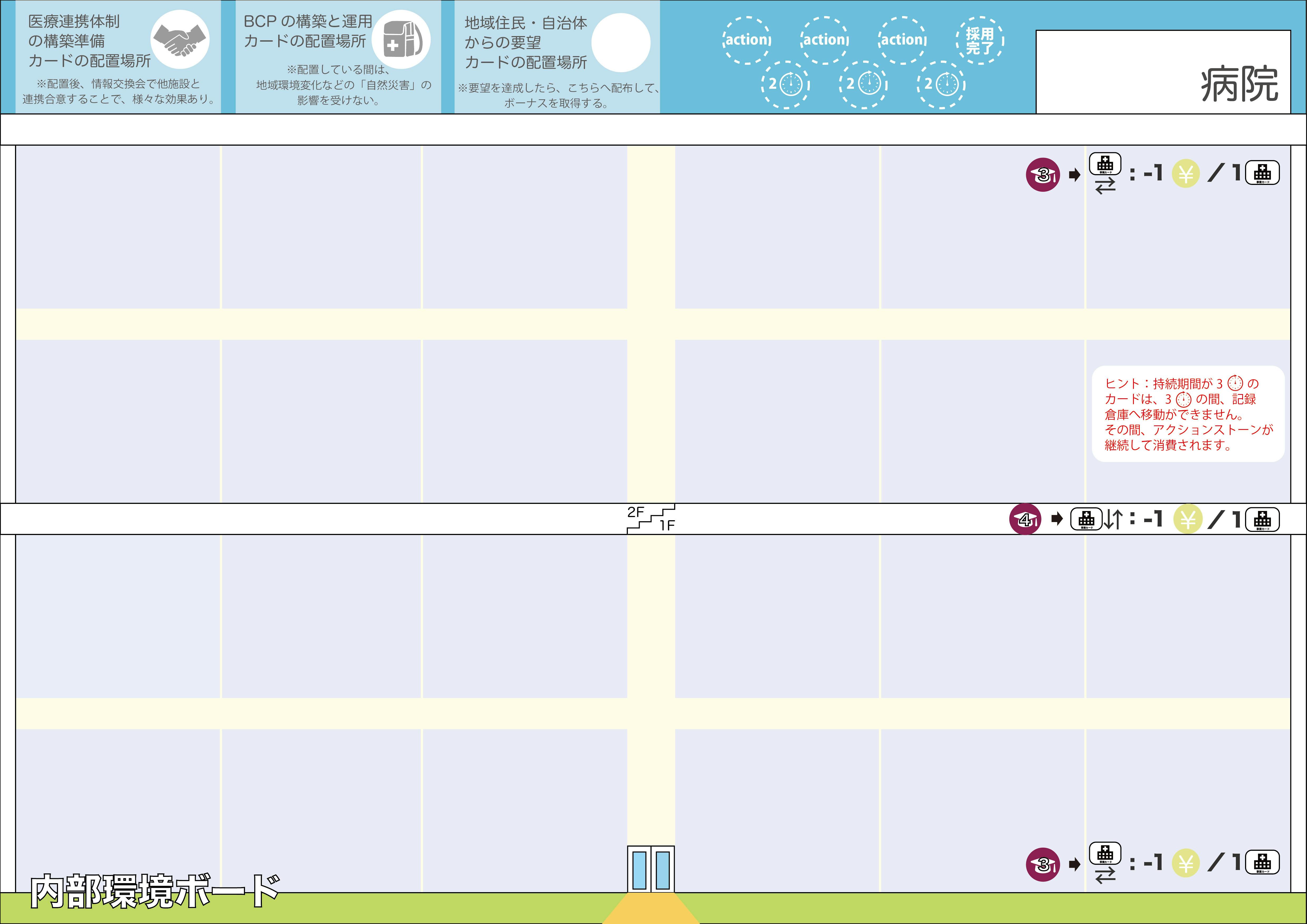 外部環境カード(13種類)、地域環境カード(24種類)、院内イベントカード(12種類)、ミッションカード(4種類)、戦略カード(75種類)
