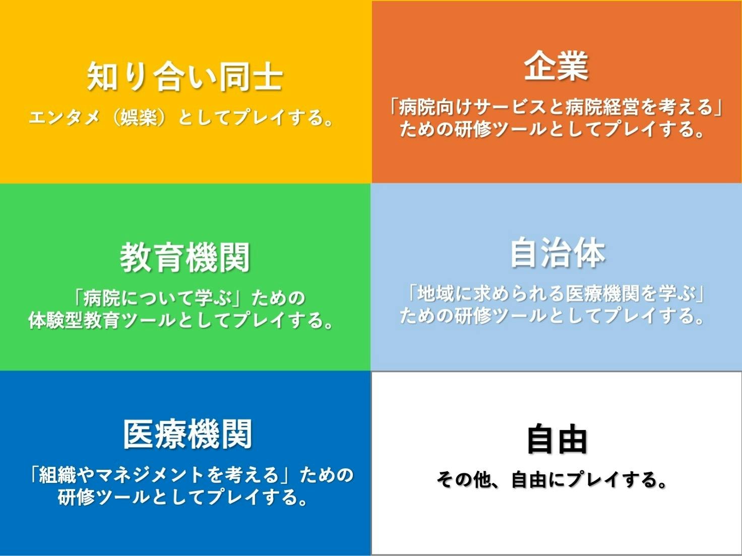 医療を知りたい、病院を知りたいという最初のステップにゲームを選んでみてはどうでしょうか。すごろくやカルタとは違い、少し入り組んだボードゲームになっていますが、ルールを理解すると楽しんでプレイできると思います。現役医療者やヘルスケア関係の企業人はもちろん、地域で医療福祉に関わる方々、学校の先生や行政職の方、地域政策に関わる地方議員の方まで。そして、医療職が気になり出した高校生や親族に医療者がいる中高生など、幅広い方々に医療を知っていただくツールになると思っています。
