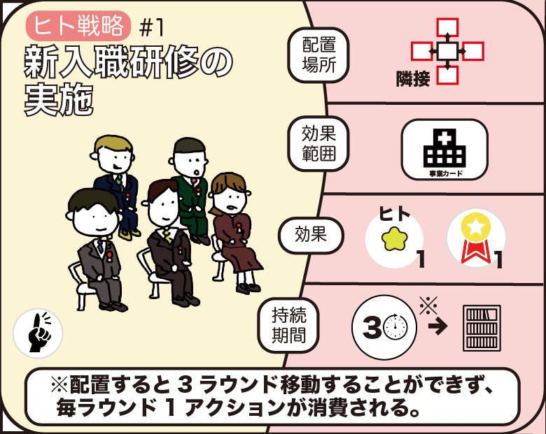 4. アクションを3つ行う:「事業設置」「戦略遂行」「ミッションを掲げる」「自己研鑽」「特殊活動」の5つ中より、3つのアクションを行います。尚、同じアクションを2回以上行うことも可能です。