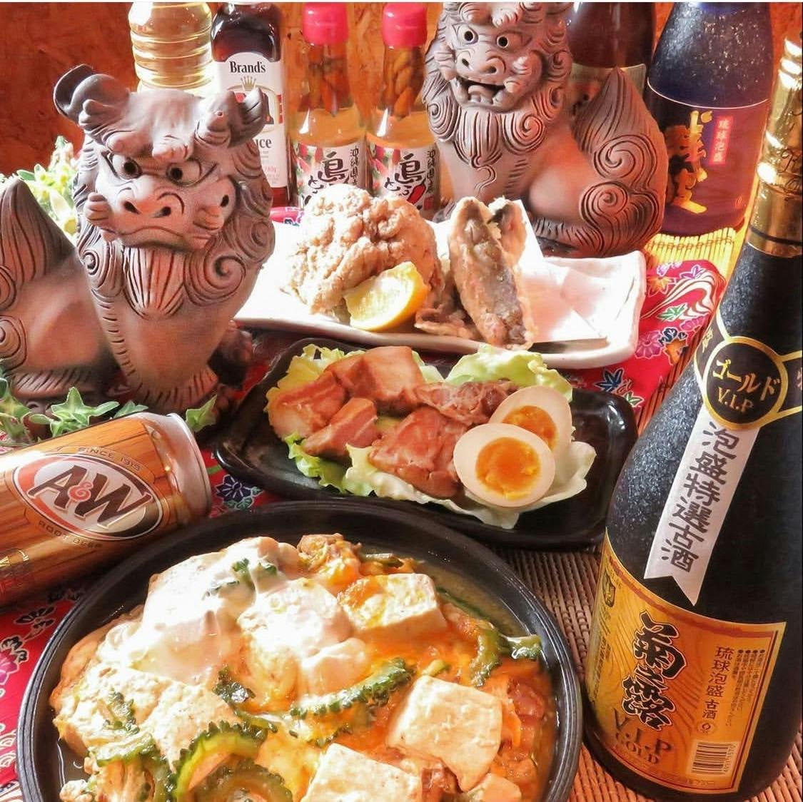 10名までの貸切パーティプランには、前菜・刺身・チャンプルー・揚げ物・ソーキそば・ブルーシールアイス、さらにソフトドリンクや壷泡盛の呑み放題もご用意。沖縄の空気をそのまま味わっていただける特別なプランです。オプションで三線LIVE(有料)をご用意することも可能ですので、ぜひご相談ください。
